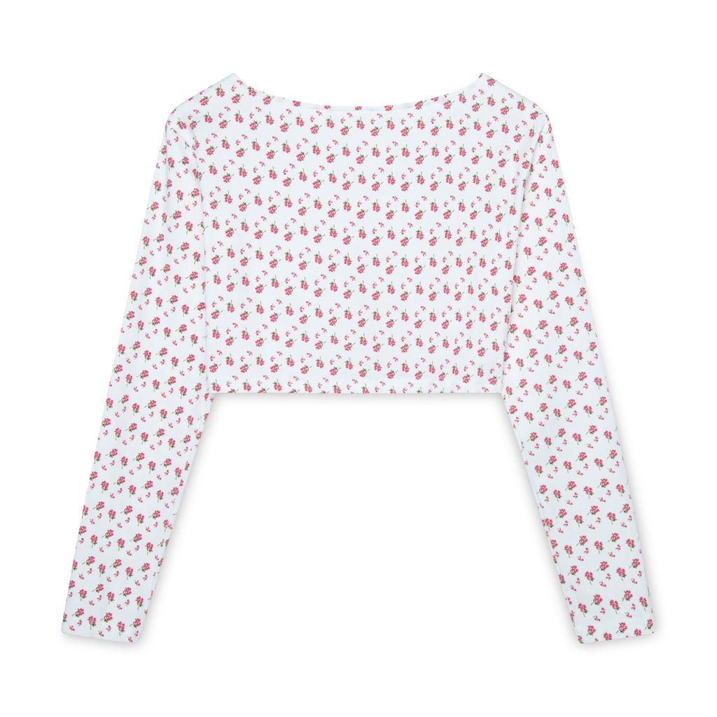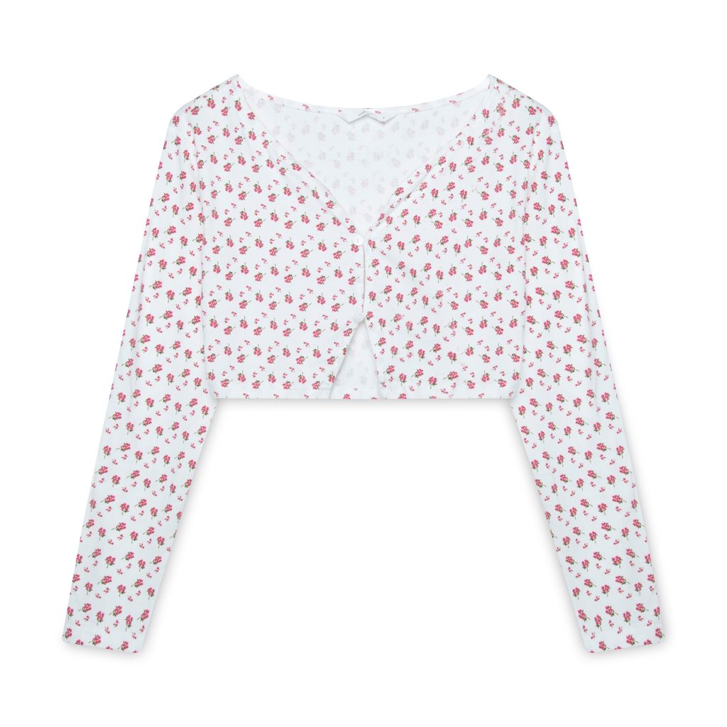 437 Floral Cardigan features boxy cut, cropped silhouette, and button closure.