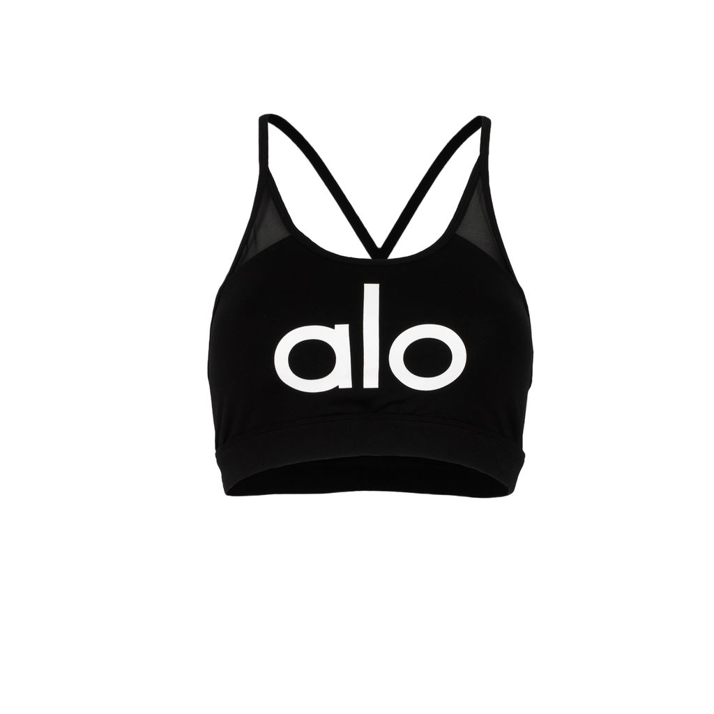 Glam high-neck style with slim crisscross straps in the back, the Starlet Bra from Alo Yoga has small mesh details for breathability and inversion-friendly front coverage with medium support and removable cups.