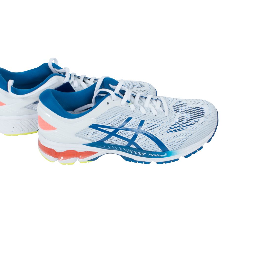 Enjoy luxurious comfort and improved bounce with the men's GEL-KAYANO® 26 running shoe, featuring GEL® technology to the forefoot and rear for high-density shock absorption and a comfortable feel over long distances. Featuring a jacquard mesh upper and FLYTEFOAM® Propel technology for a lightweight quality that allows your feet to breathe, this ASICS running shoe is all about going the distance, providing exceptional support and comfort over long periods of time. The EVA sockliner offers excellent rebound and cushioning, while the Guidance TRUSSTIC SYSTEM® technology brings a new level of stability, working with the contoured midsole to help control torsion. Meanwhile, the SpEVA 45 lasting improves bounce-back characteristics to put a spring in your step (quite literally). If your feet tend to roll inwards as you run, fret not. The DUOMAX® midsole offers smooth overpronation control by combining two different density materials to reduce the risk of flat feet and bunions. Meanwhile, the AHAR® rubber sponge helps to reduce excessive wear for a longer lifespan. This edition of the GEL-KAYANO® 26 running shoe showcases a vibrant new design to inspire you to unleash your inner runner, on those days when you might need a little extra motivation, while added reflective details improve your visibility when you're out after-dark.
