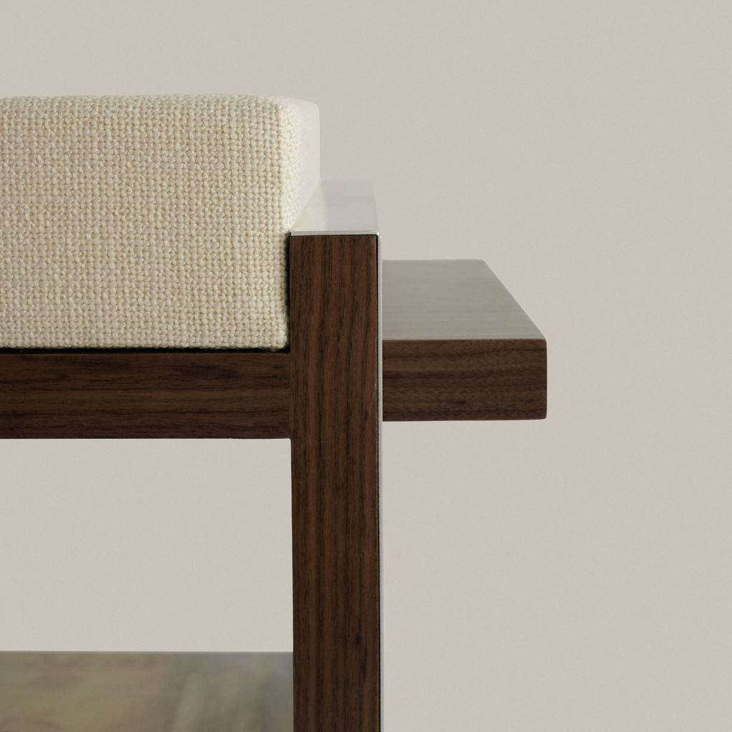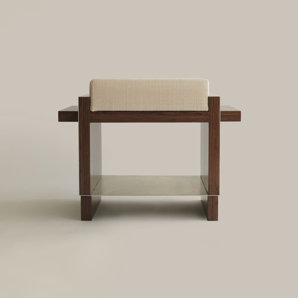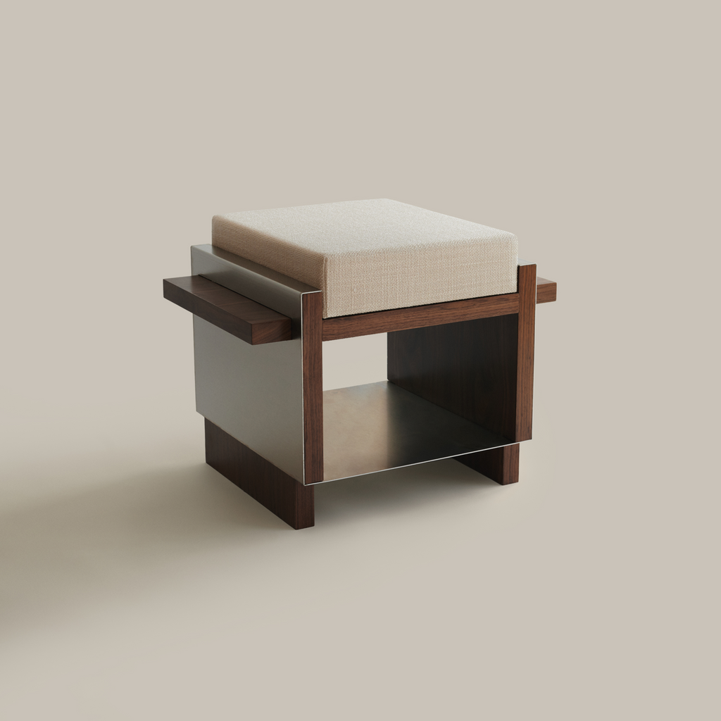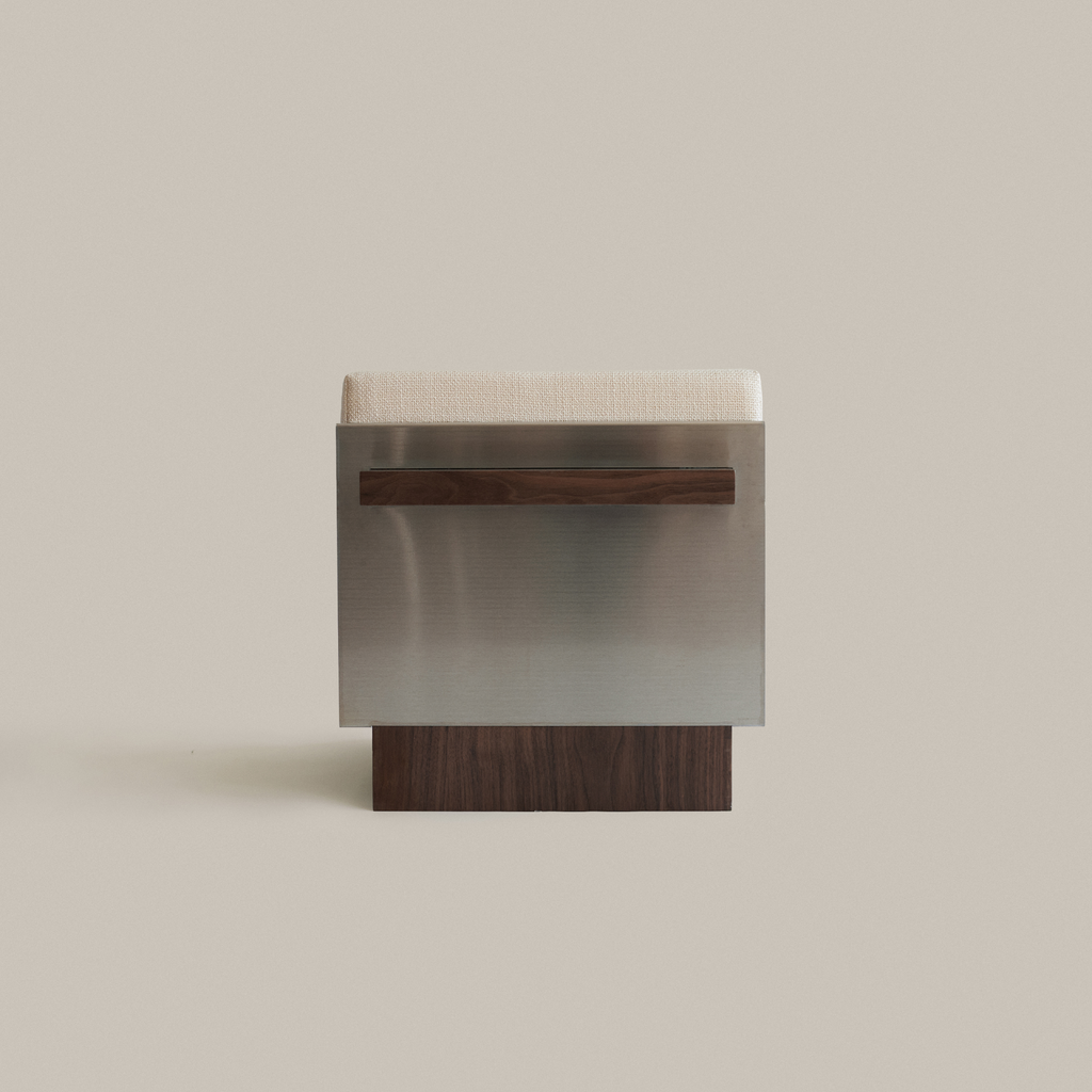 Based on architectural visual references and built heritage from the second half of the 20th century, combined with new contemporary interpretations of functionality and materfoam,fabric the B1 Stool emerges from sculptural volumes and structural elements (interior and exterior) that emphasize the harmonization of these concepts. The composition is based on the variety of materials applied in the three different moments of the object: structure [walnut natural veneer], seat [high-density foam,fabric], and covering [stainless steel sheet].