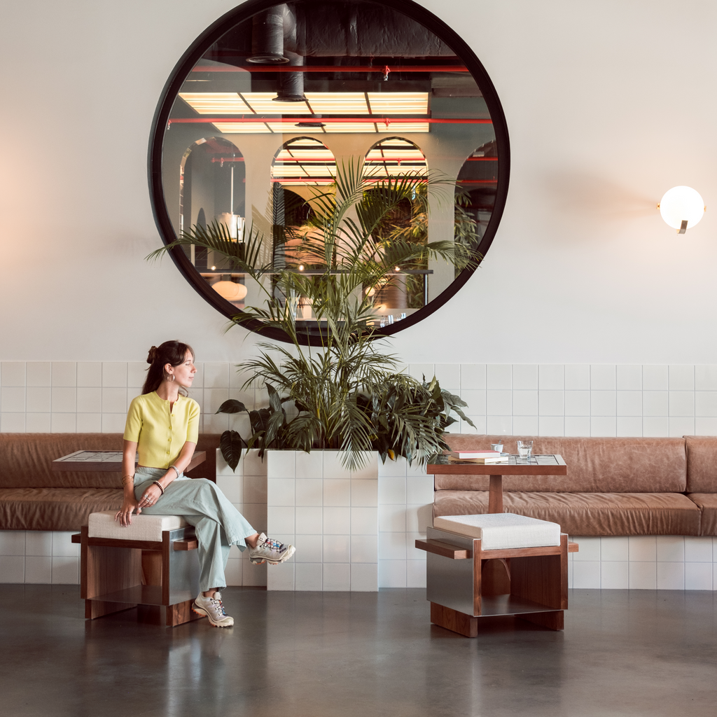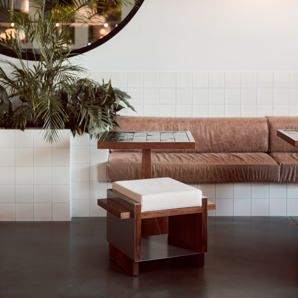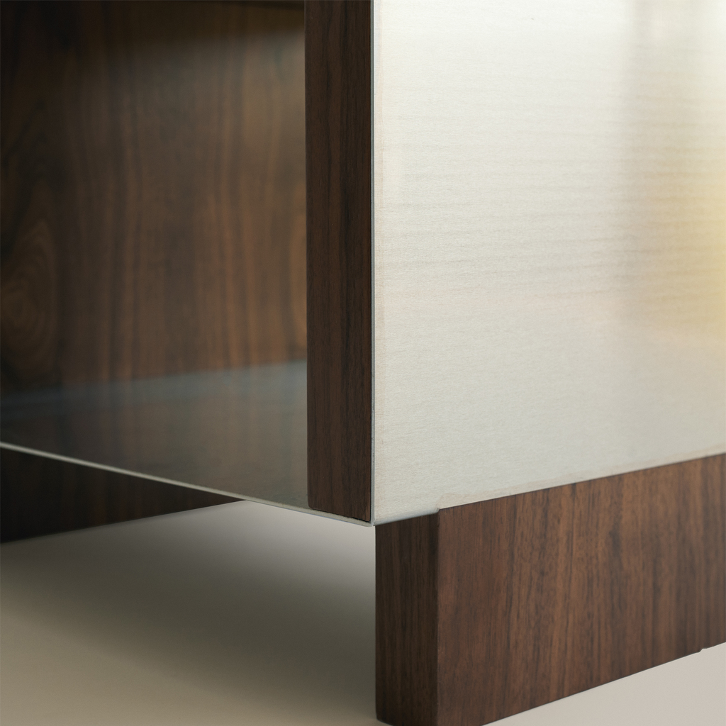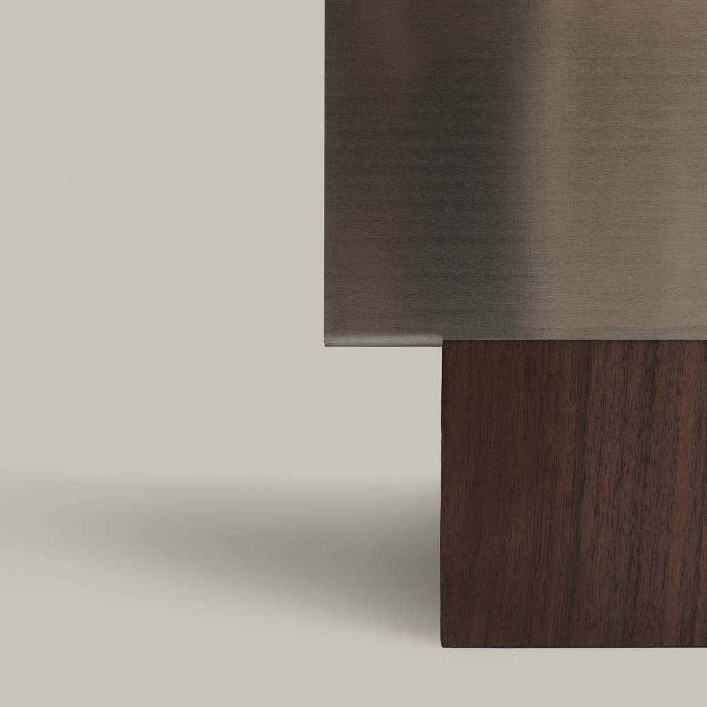 Based on architectural visual references and built heritage from the second half of the 20th century, combined with new contemporary interpretations of functionality and materfoam,fabric the B1 Stool emerges from sculptural volumes and structural elements (interior and exterior) that emphasize the harmonization of these concepts. The composition is based on the variety of materials applied in the three different moments of the object: structure [walnut natural veneer], seat [high-density foam,fabric], and covering [stainless steel sheet].