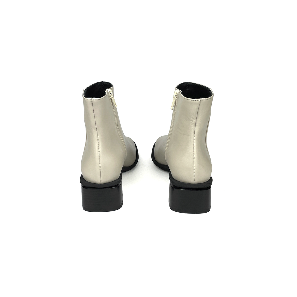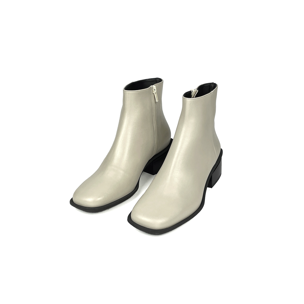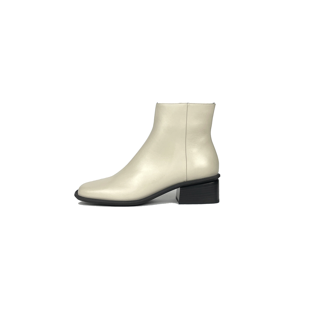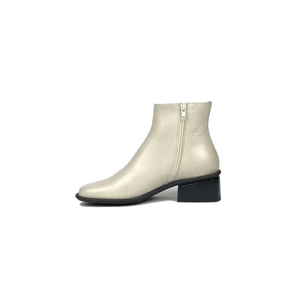 The Bare Boot is an easy and versatile ankle boot with a low heel and side zipper closure. It has a rounded square toe with a protective visible outsole lip. The upper is made with a custom refined calf leather that is smooth and durable.