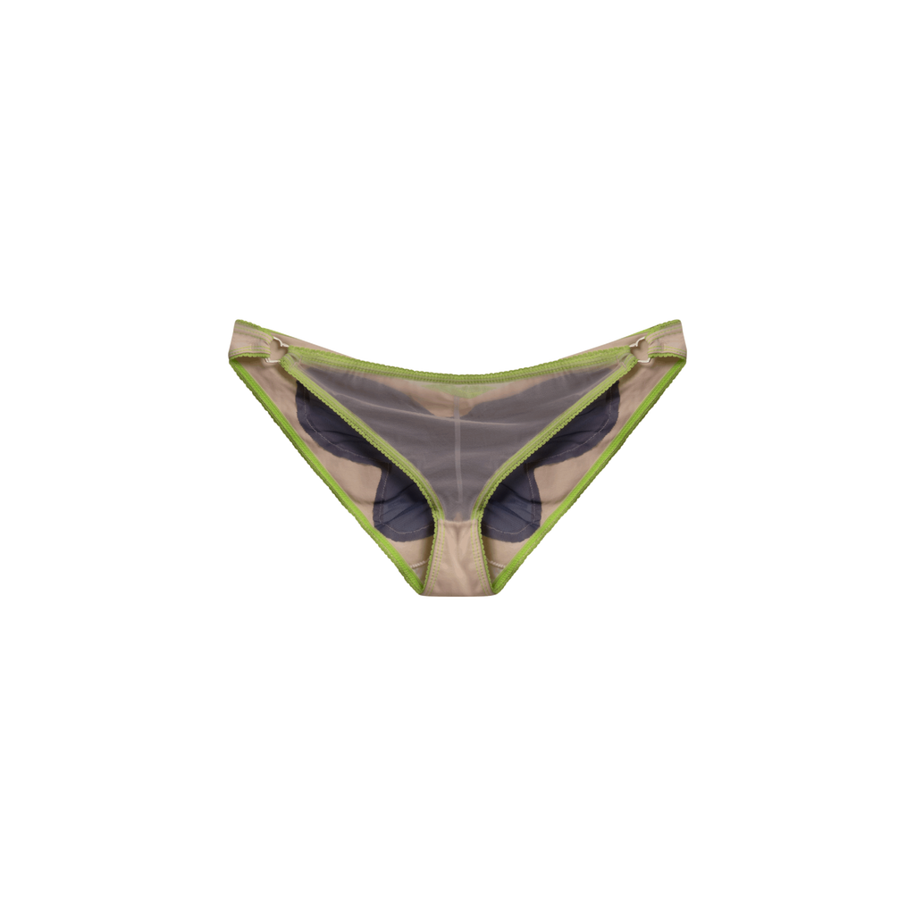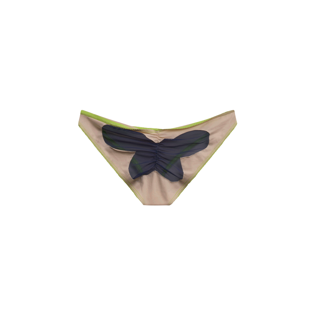Beige and purple 88 Brief features elastic picot trimming, polyester blend mesh butterfly cut-out, and cheeky midline gathering.