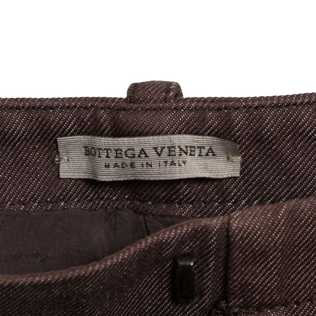 This vintage denim pencil skirt from Bottega Veneta features a front clasp-zip closure, front pockets, belt loops and has a mini silhouette. This skirt is fully lined with a silk, in excellent condition, contrast tone due to uneven fading from age.