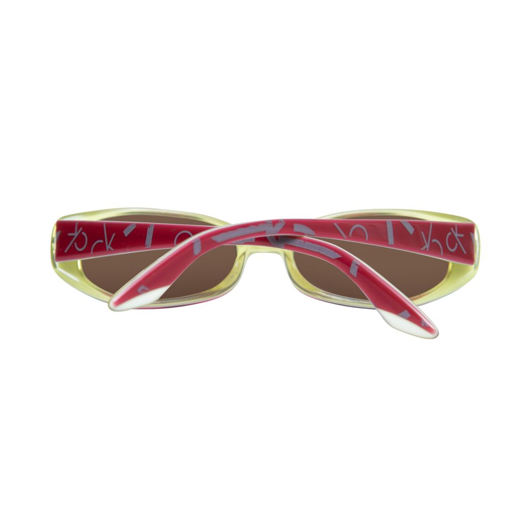 Calvin Klein Pink and Yellow Sunglasses features pink exterior, yellow interior, and logo print on arms.