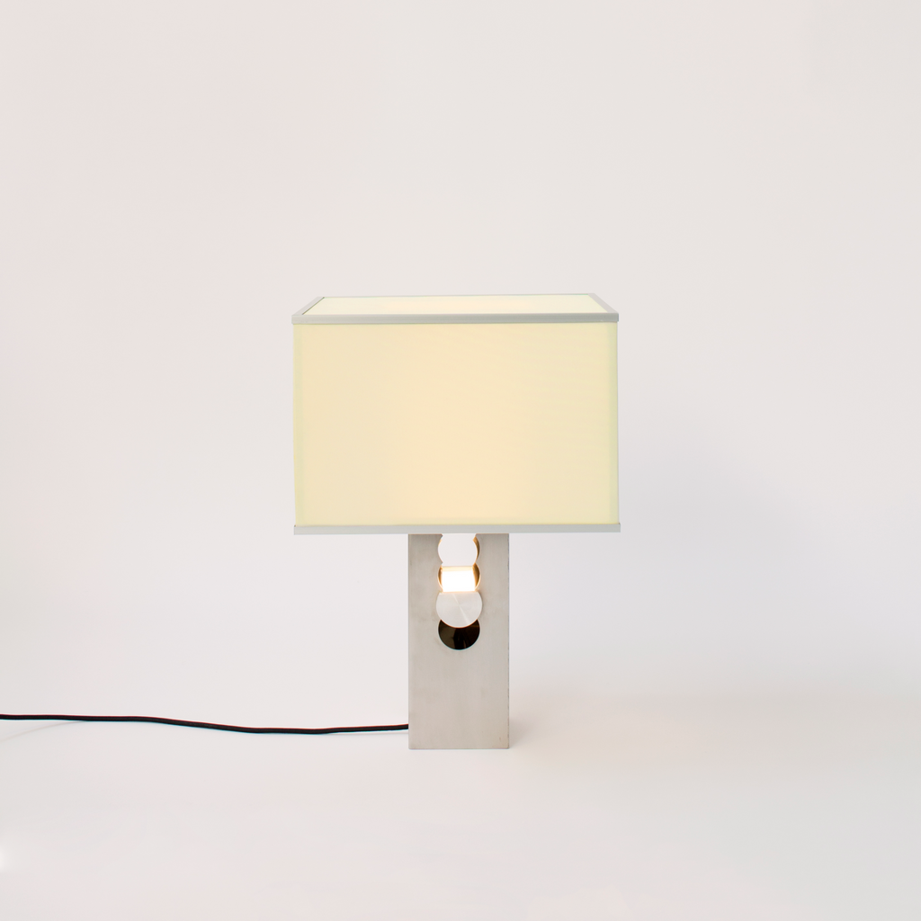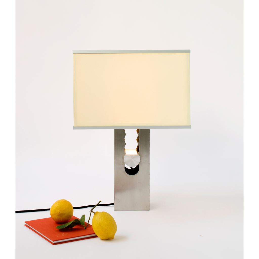 The Captive Table lamp features a light source that moves along a track built into a solid metal structure. Made from folded, cut, and welded stainless steel, it resembles a treasure chest from which light radiates with adjustable intensity and spread, thanks to a mechanism inspired by common hand tools used in manual work. Its design is clean and almost brutal in its essentiality, where technical elements become decorative features. The track creates a seamless connection between inside and outside on two opposing sides. In the Captive Table Lamp, nothing is superfluous—everything serves a purpose. Each technical detail is carefully designed for maximum practicality and versatility, reflecting the finest tradition of Lombard craftsmanship. Shipping lead time of 60-90 days.