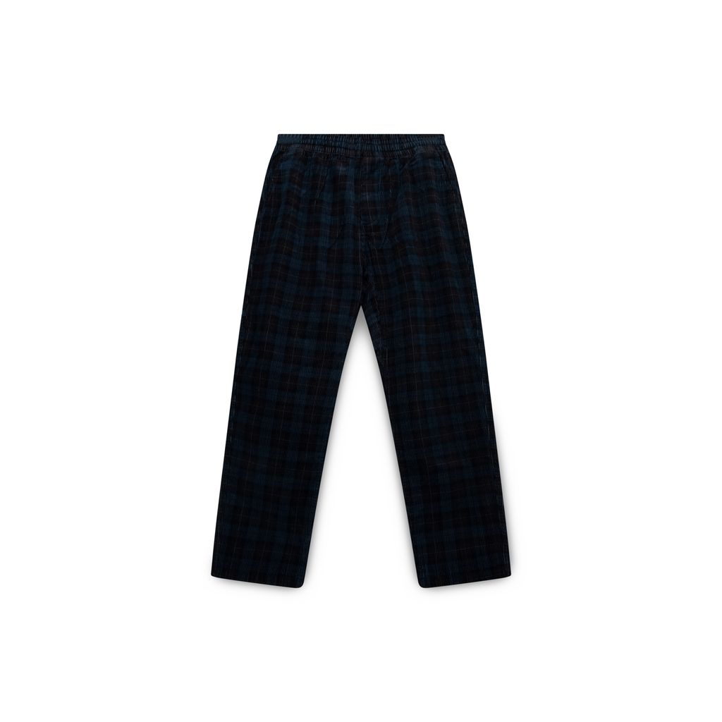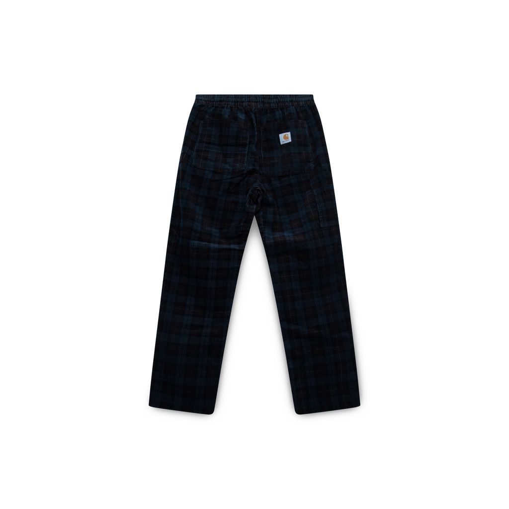 Carhartt Work in Progress Flint plaid drawstring corduroy pants features elastic waistband, straight legs, six pockets, front zip and button closure, and patch logo at back.