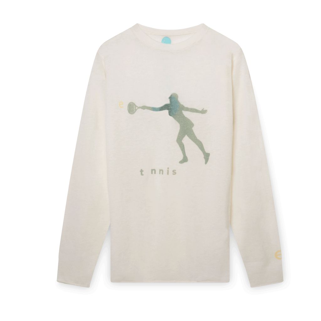 This long sleeve shirt features a tennis graphic designed by artist Adrian Schachter. It is 100% cashmere, semi-sheer, has a slightly oversized fit, and is the most comfortable shirt you'll ever own.