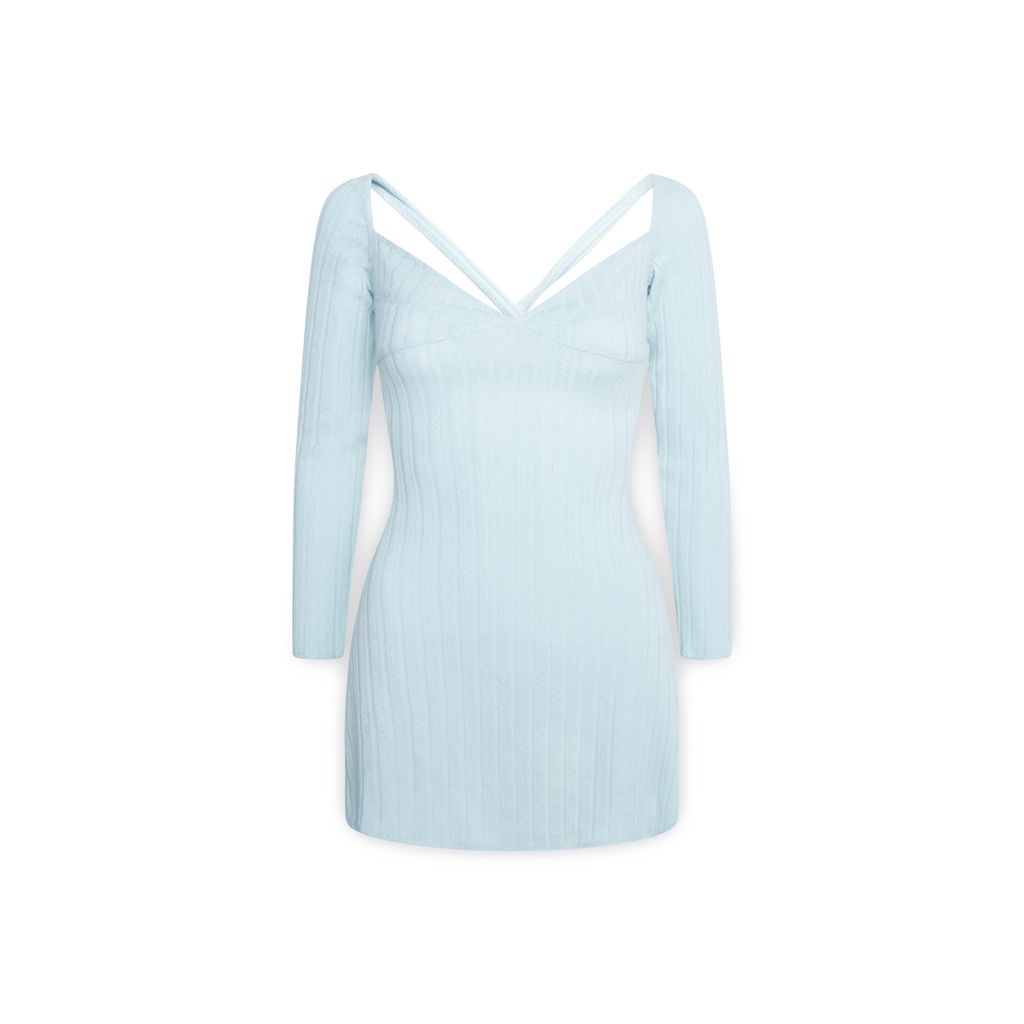 Celestine Dress features long sleeve cable knit mini dress, open back, and adjustable self tie lacing at back.