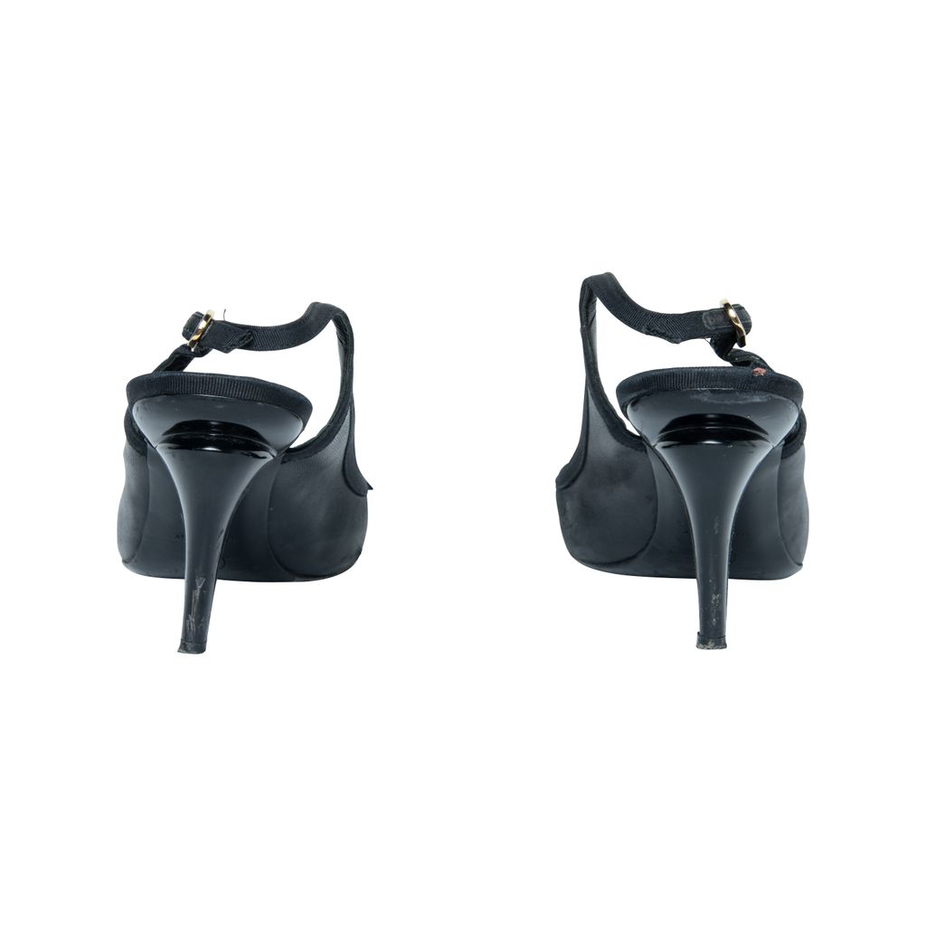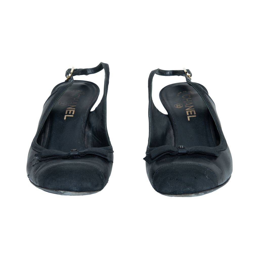Chanel classic sling back features round toes, leather and grosgrains, bow detail with cc logo at front, and slingback with gold hardware.