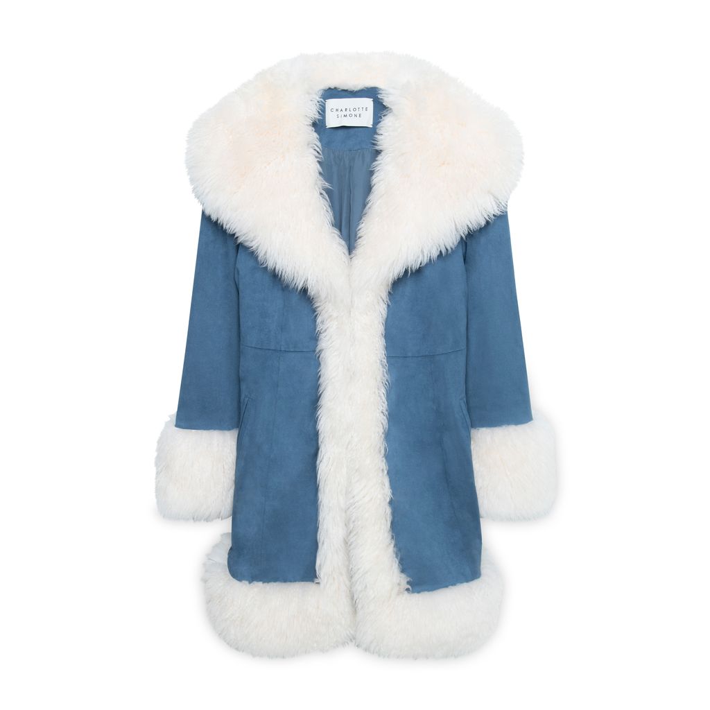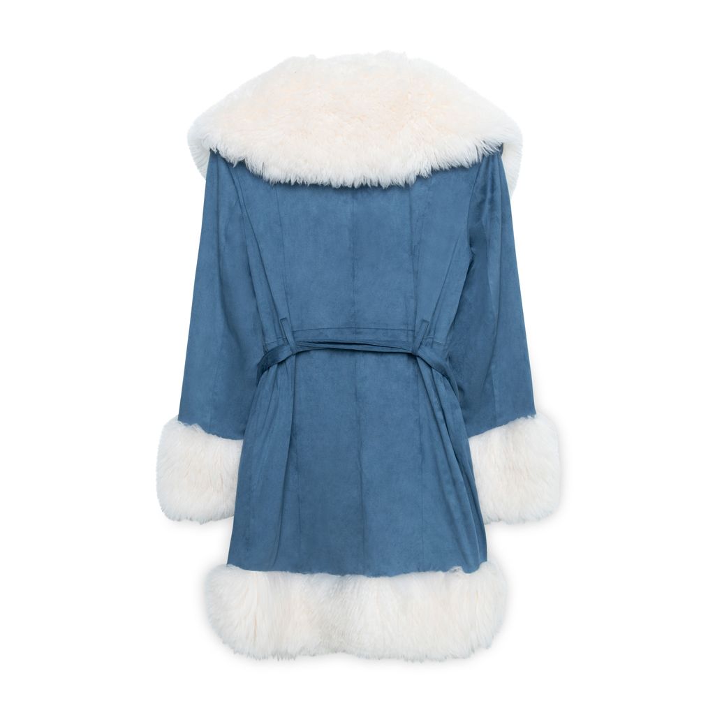 Charlotte Simone Dolly Coat in Blue features white faux fur and blue tie at the waist.