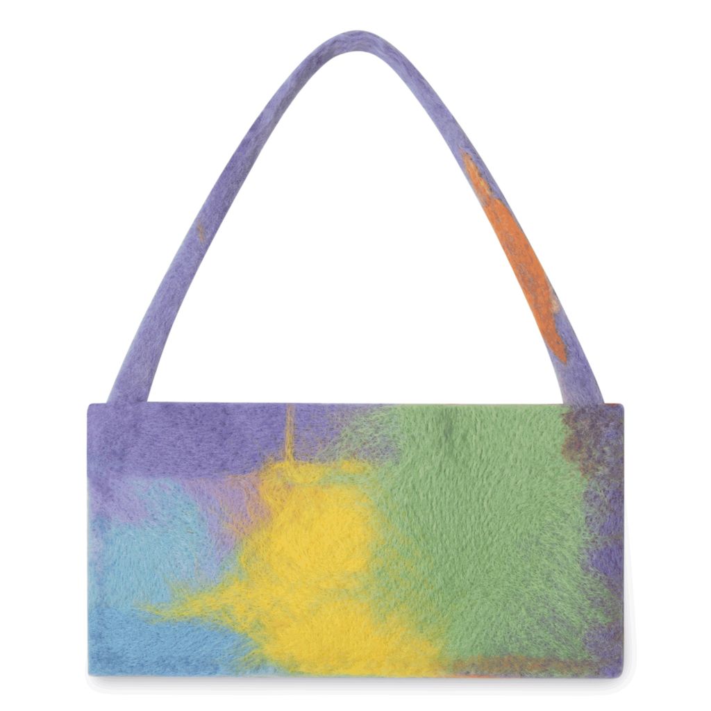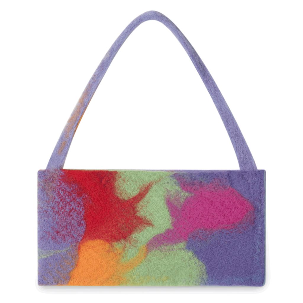 Squared off baguette style shoulder bag that can fit a phone, cardholder, headphones, and chapstick. Handmade in NYC using wool roving. Each bag is unique. Handle with care. Contains snaps for closure