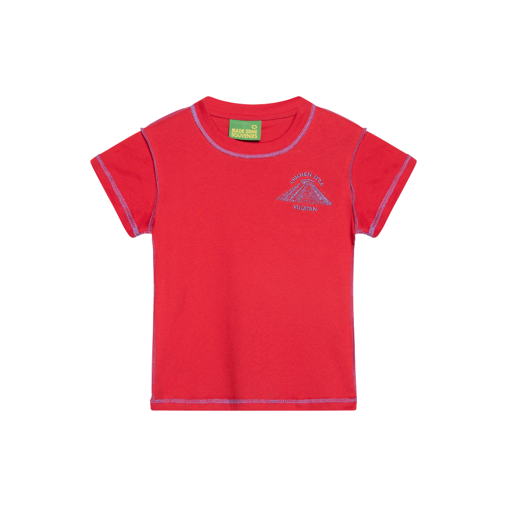 Chichen Itza Tourist Tee features contrast stitching, baby tee fit, and Chichen Itza graphic embroidered on chest.