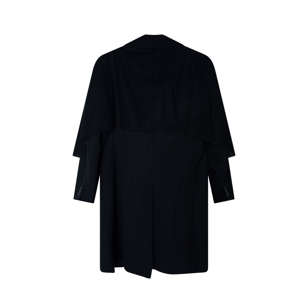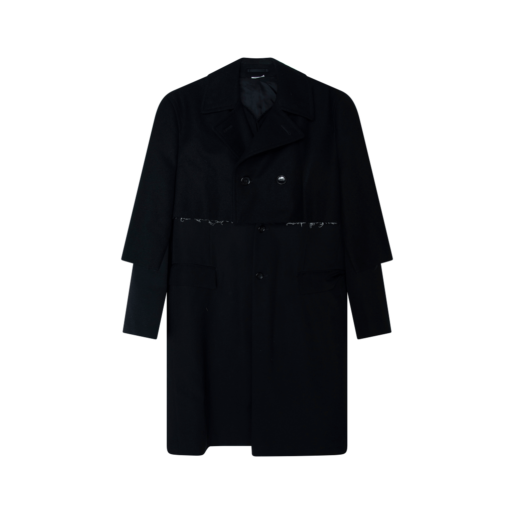 Comme Des Garçons Homme Plus Black Wool Gabardine Layered Coat features partially concealed front button closure, overlay notched lapel collar with raw edge at the chest, two front flap pockets, and buttoned cuffs.