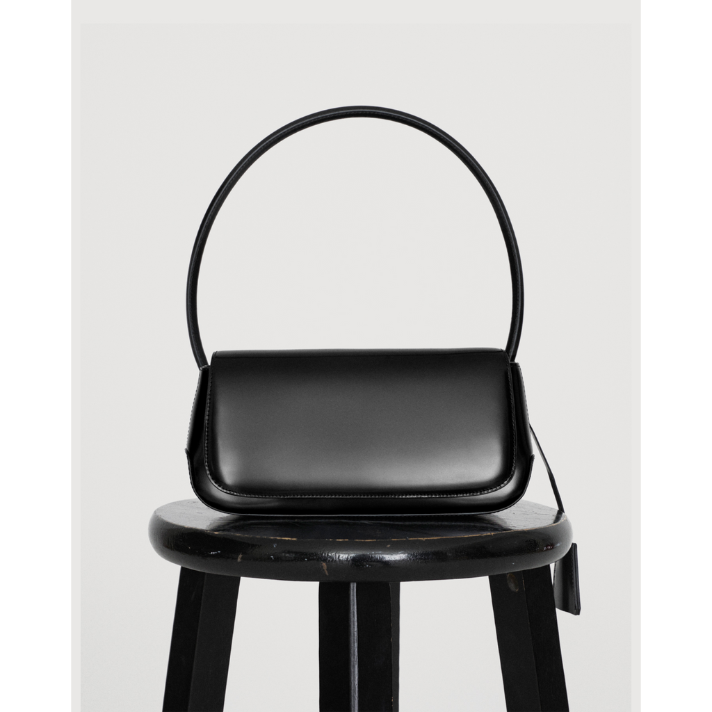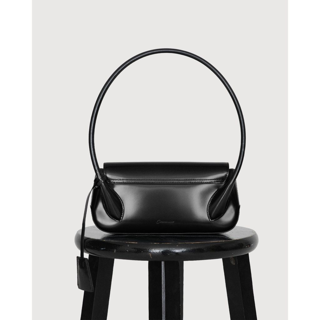 The Commission Moto Sling Bag in black is crafted from smooth leather with a clean, structured silhouette. Designed with a curved top handle, adjustable shoulder strap and secure flap closure, it offers a versatile carry for everyday use while maintaining a minimalist and refined aesthetic.