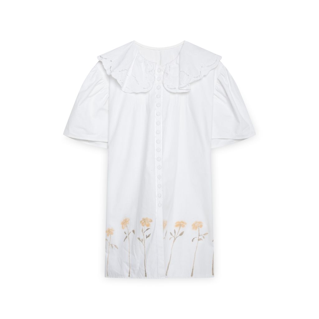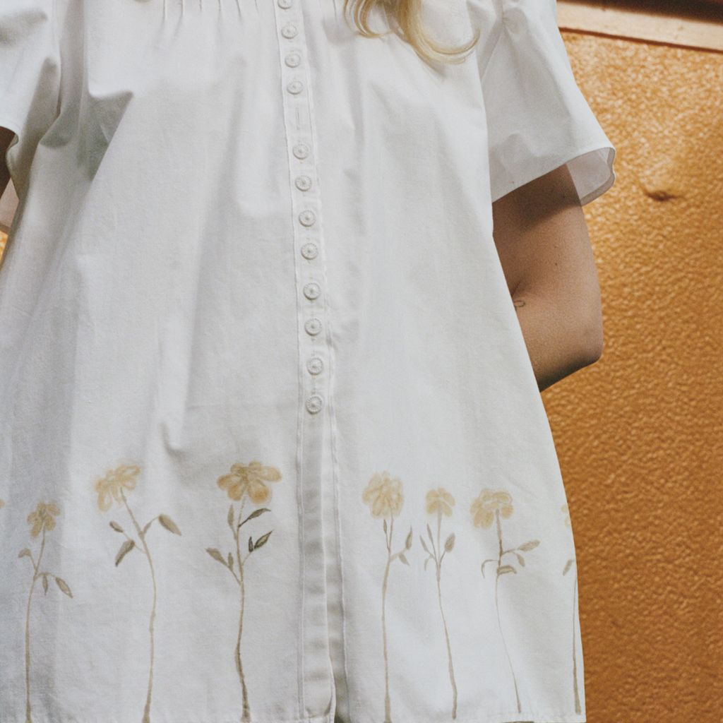 Daisy Button-Down is a vintage upcycled top with an over-sized fit that features hand-painted artwork.