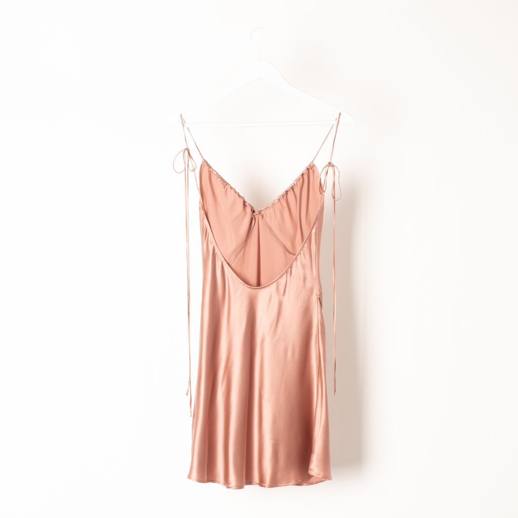 Like new, 100% silk satin slip from Daisy. Halter style dress with gathered detailing and crossover adjustable bow straps.