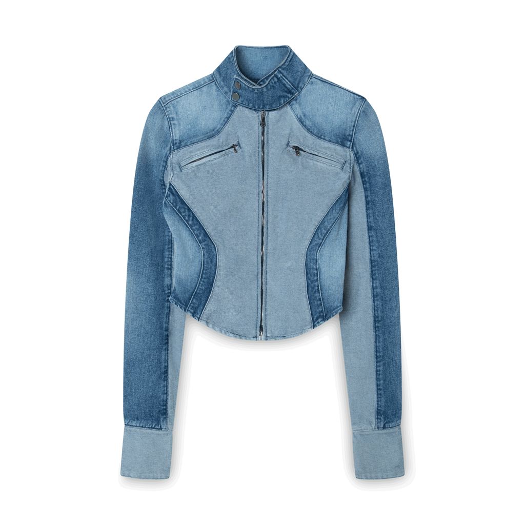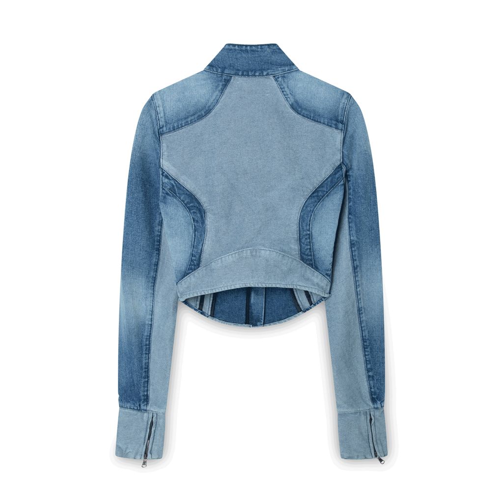 An instant classic – the 2-tone denim moto jacket is ultra-fitted and slightly cropped for a contoured waistline. It features star detail seams in the back with zippers on the center front, chest, and flared sleeve cuffs.