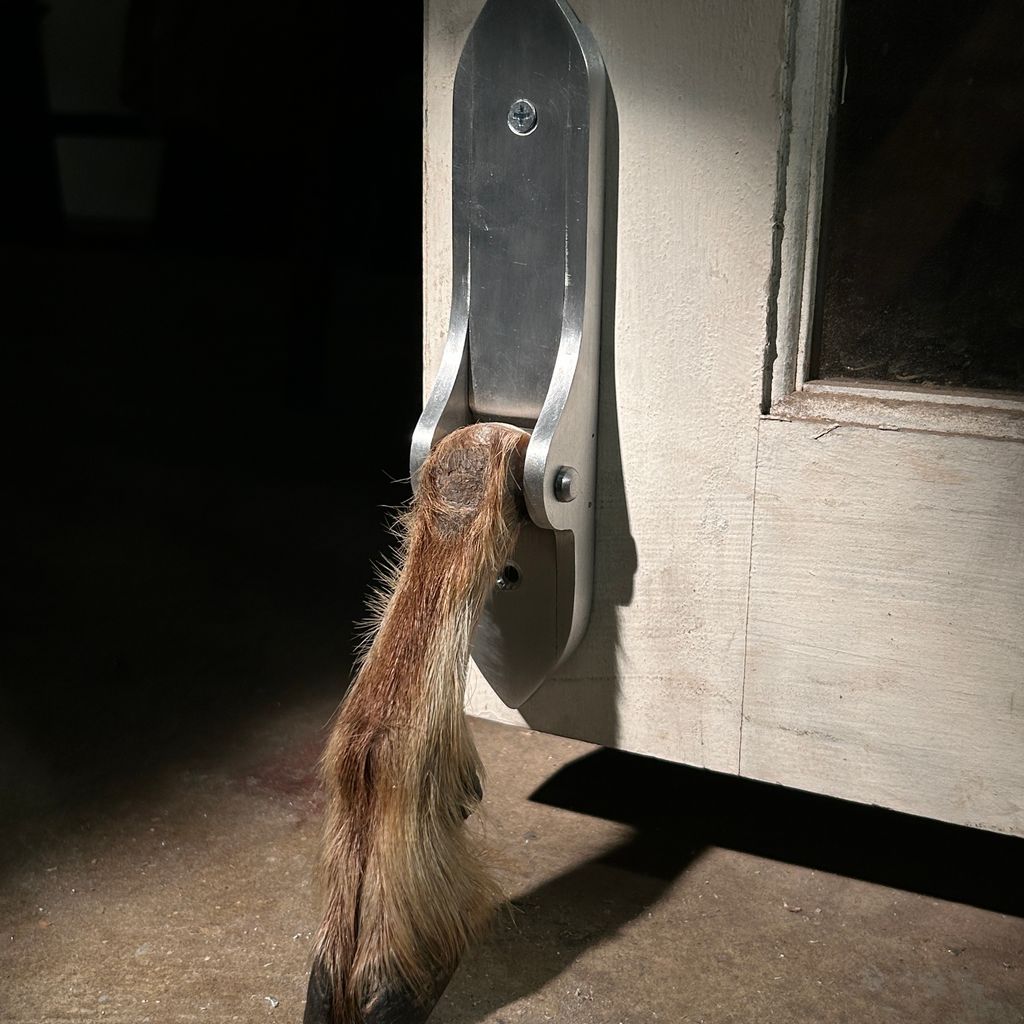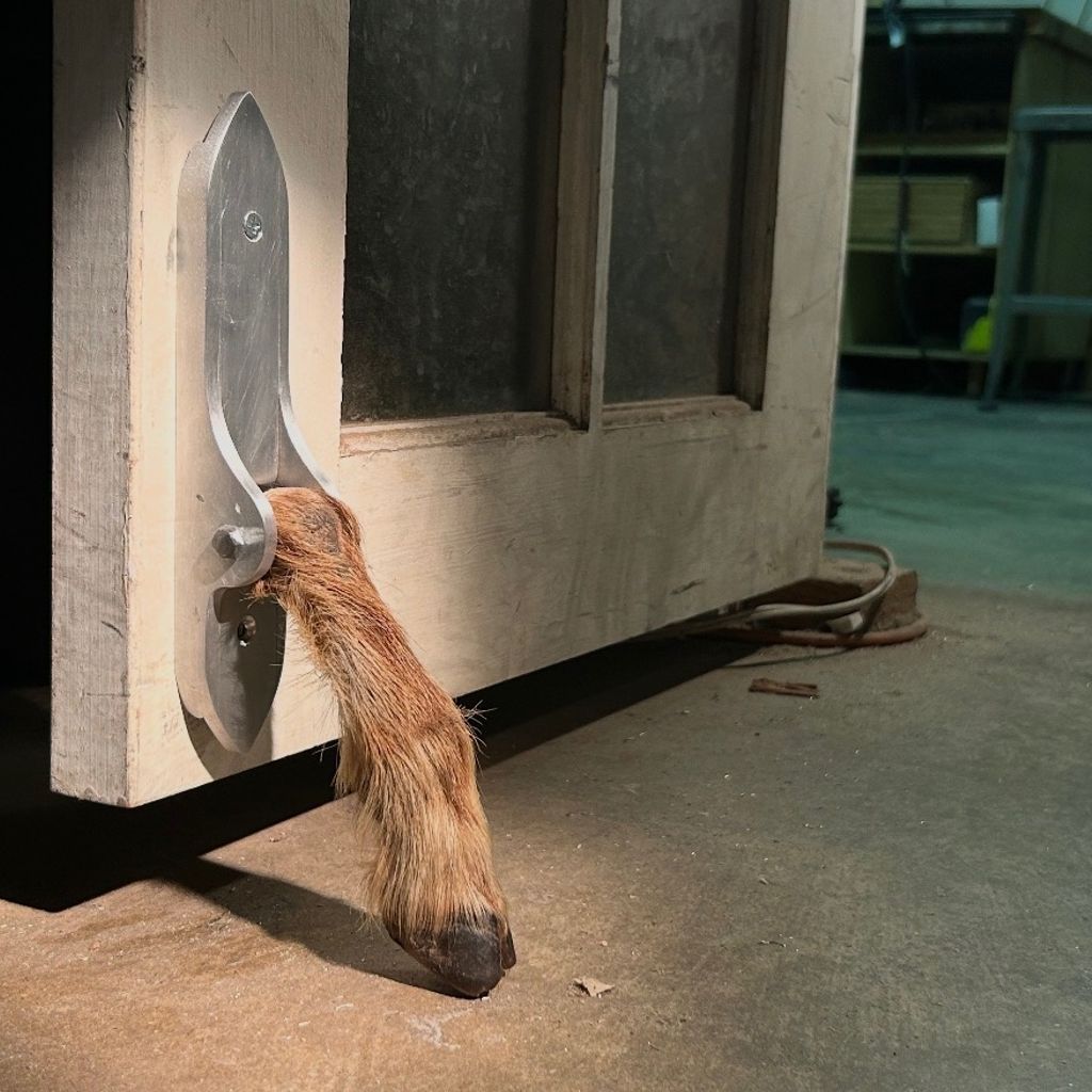 Aluminum, taxidermy goat hoof, rubies.