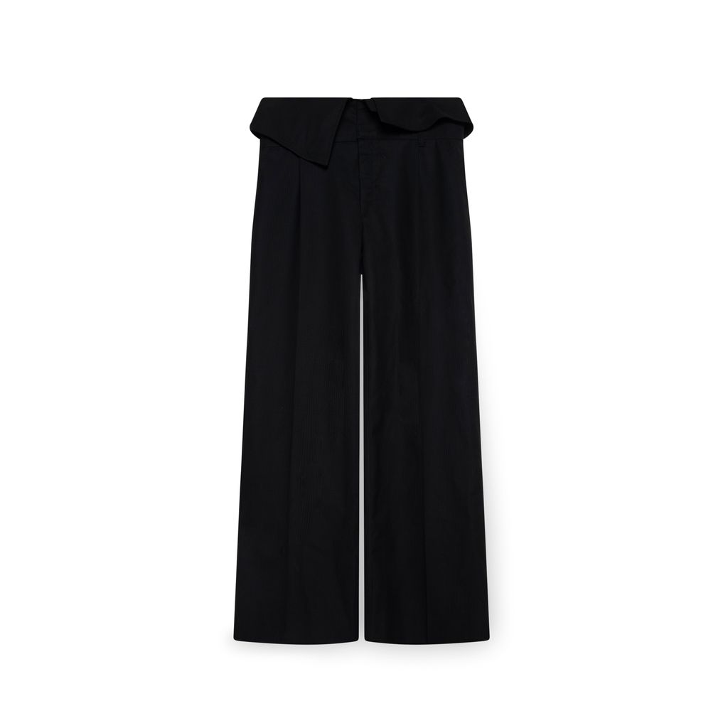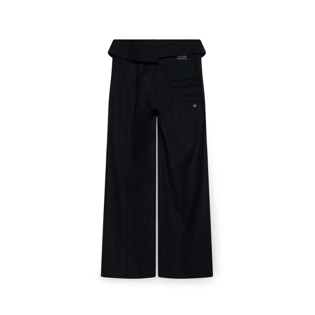Fifth Avenue Shoe Repair Black Fold Over Trousers features black pinstripe design, fold over waistband, hook and eye front fastening, and wide leg.