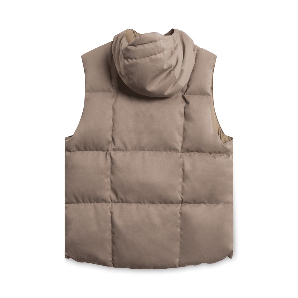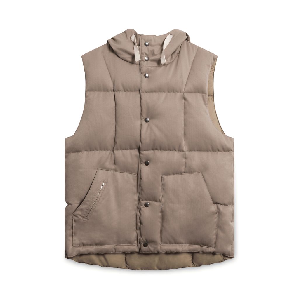 Garments Engineered Button-Down Vest in Tan features dual large open waist pockets with dual smaller zipped pockets attached, button snap closures, and hood with adjustable pulls.