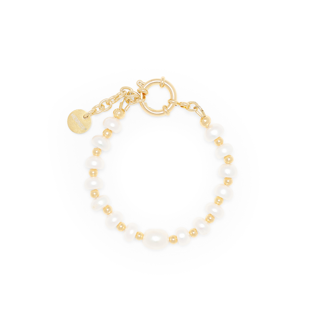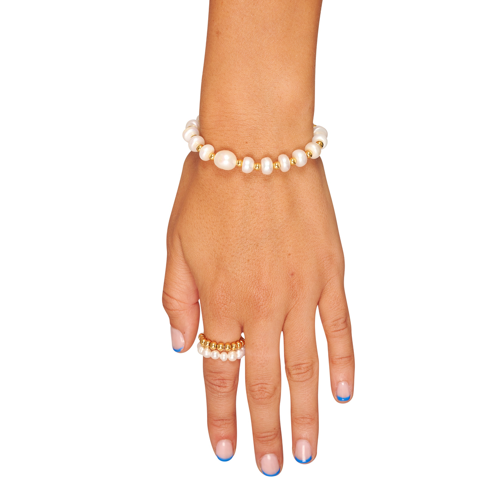 Handcrafted bracelet in 18k gold-plated stainless steel. 18k gold-plated stainless steel beads and freshwater pearls at length. Spring-ring fastening and 1.5" extension chain for adjustable sizing. Handmade in Los Angeles.