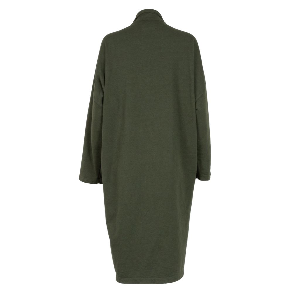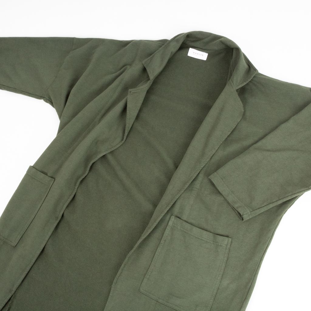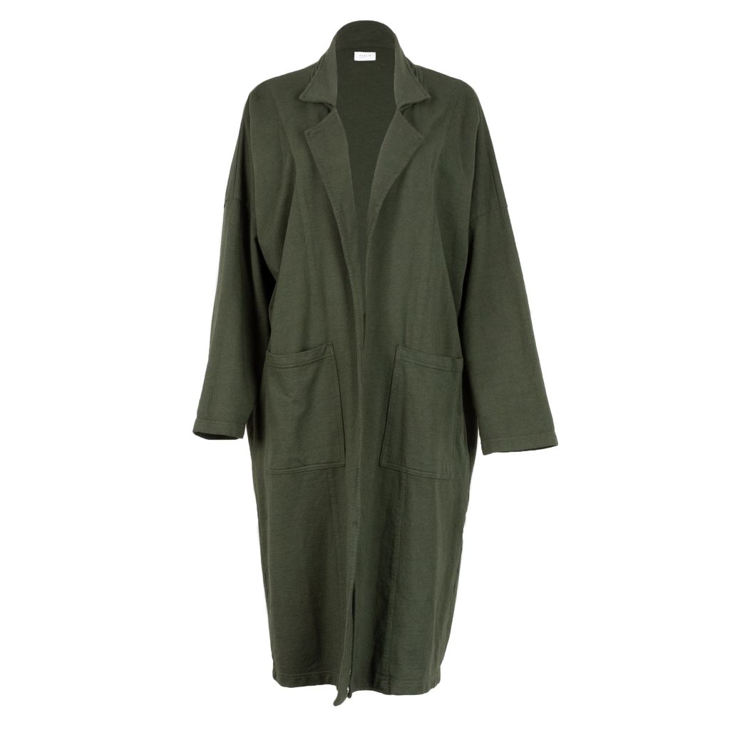 Oversized and minimal, this easy on coat jacket from Harlin California is a complimentary piece to any wardrobe. Features open front, small lapels, set of large square pockets in front, drop shoulder sleeves, and to the knee length.