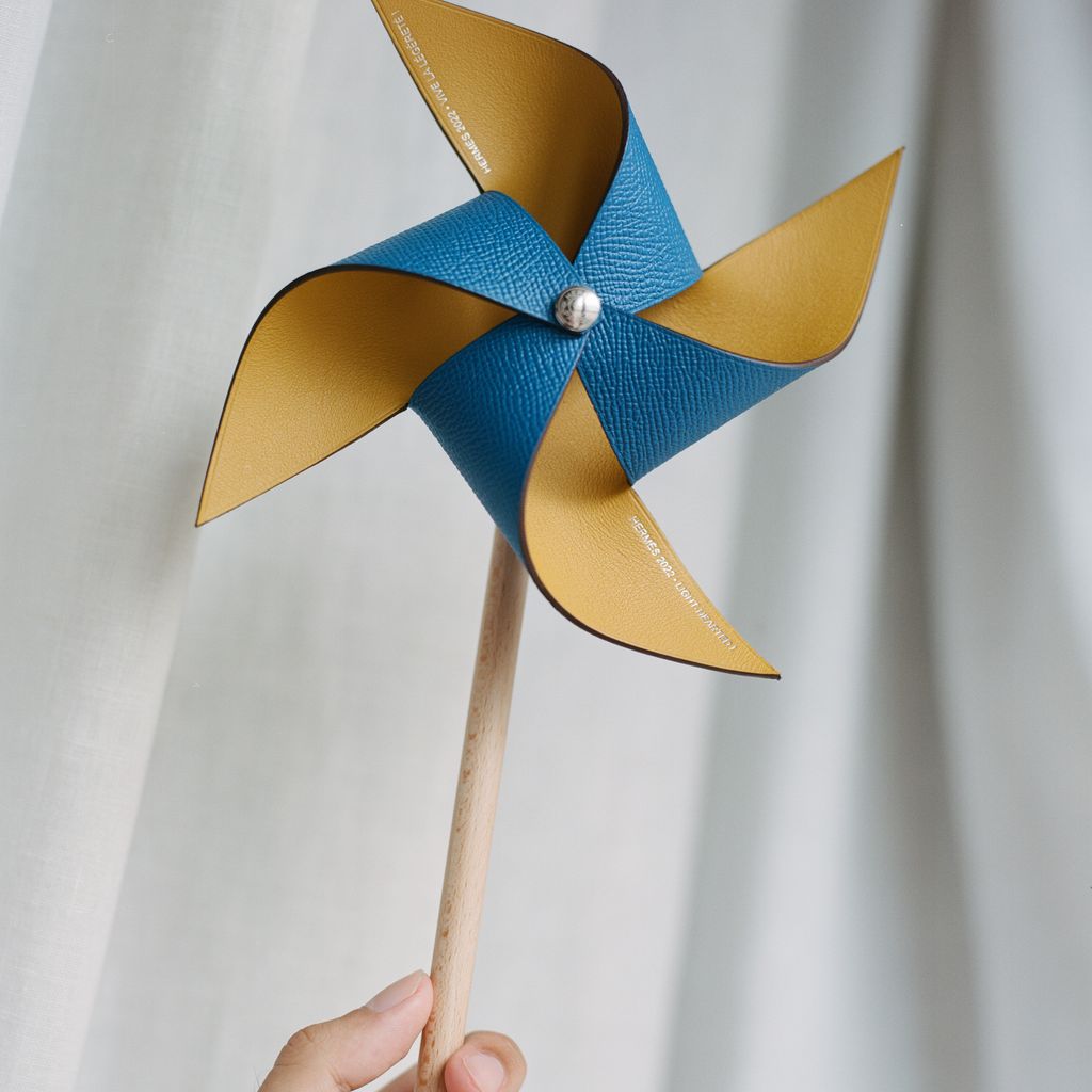A blue and yellow double-sided Epsom leather pinwheel set on a Palladium pin. Silver foiled embossed text in English and French designed to commemorate the 2022 annual theme of ‘lightness’.