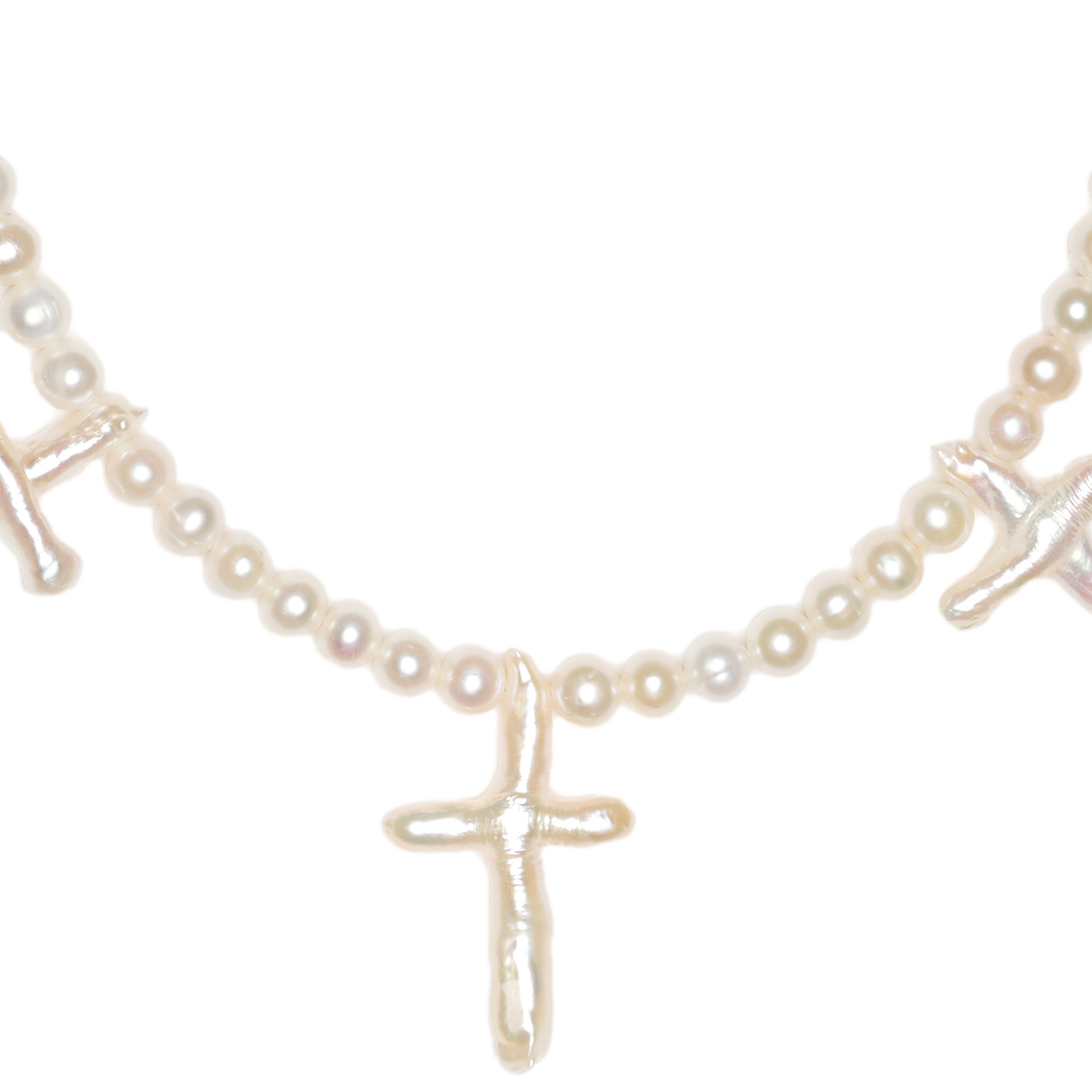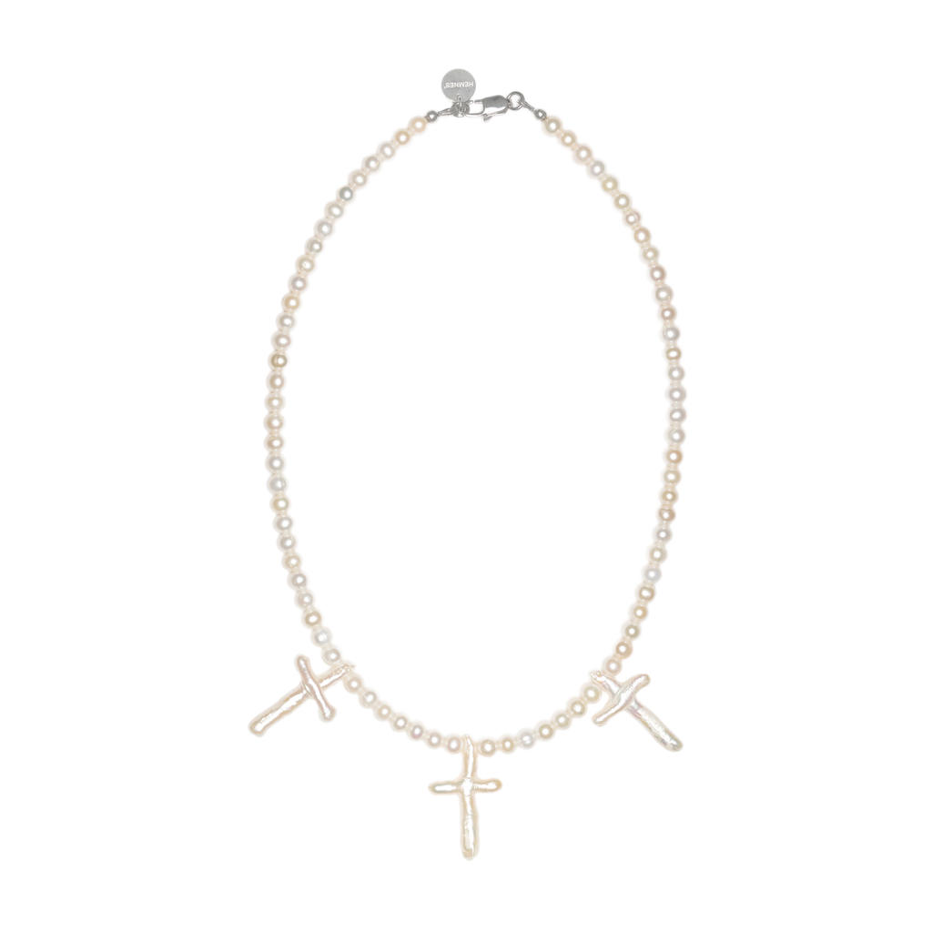 Handcrafted necklace in stainless steel. Freshwater pearls at length. Lobster clasp closure. Logo engraved charm. Made in Los Angeles, CA.