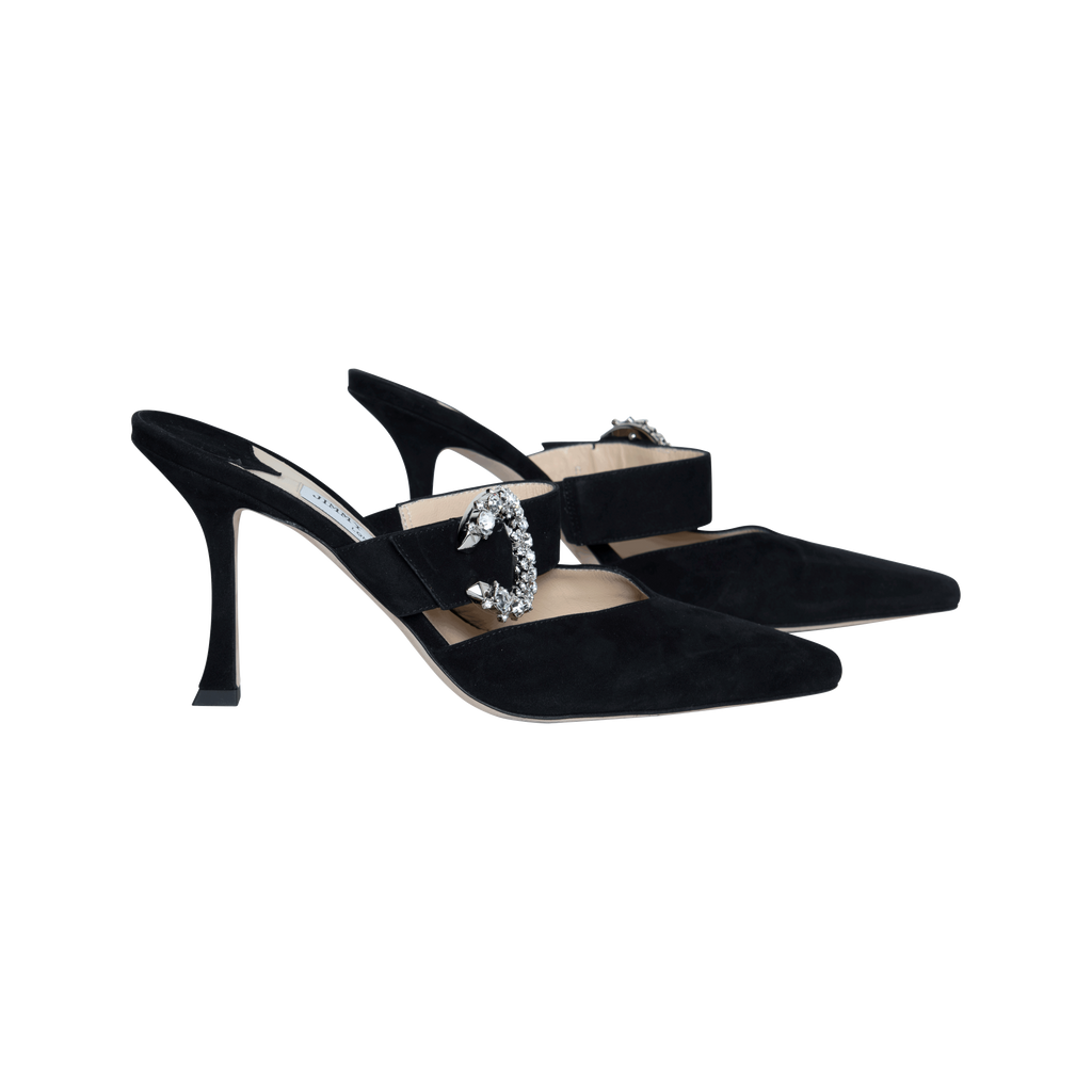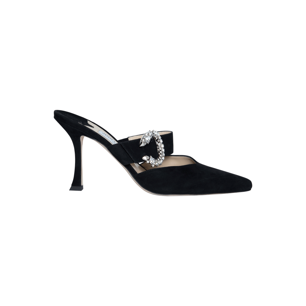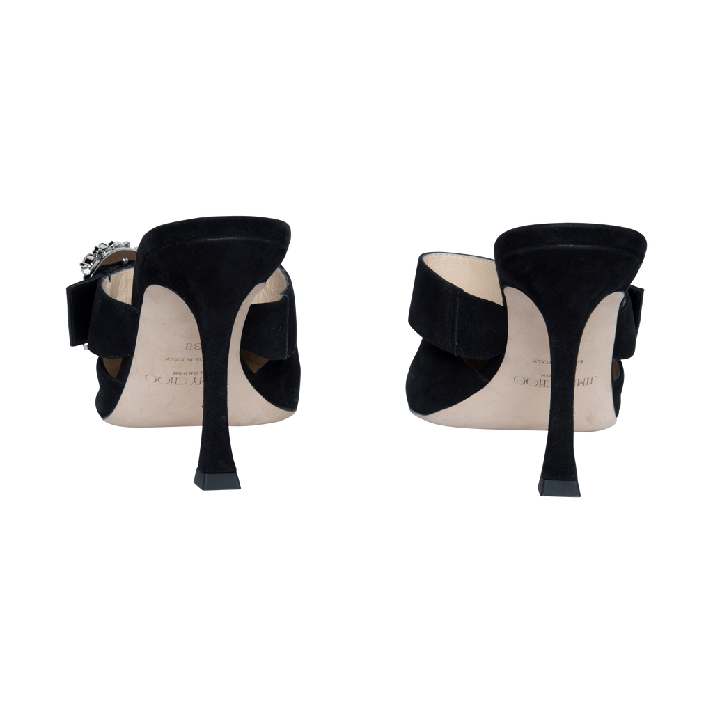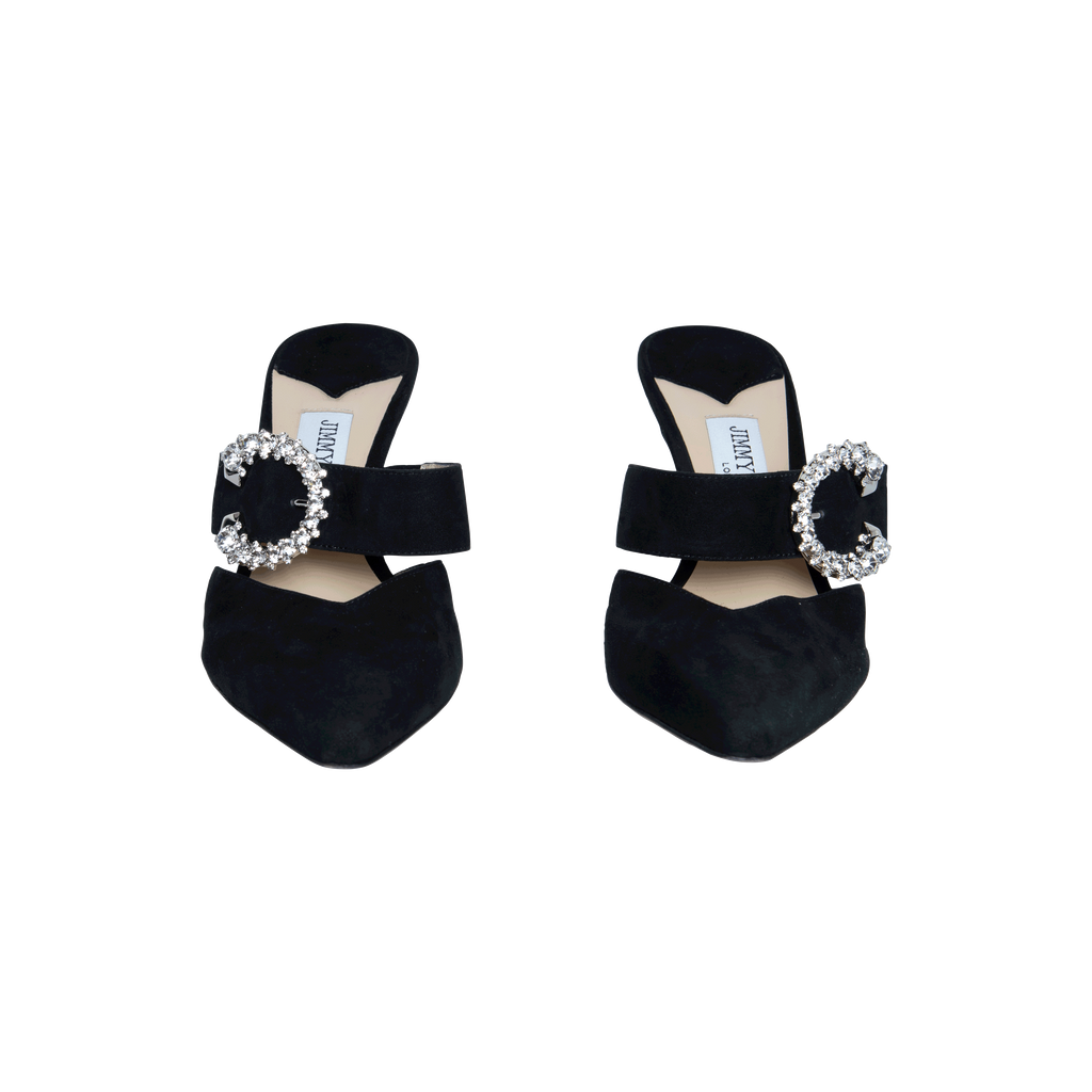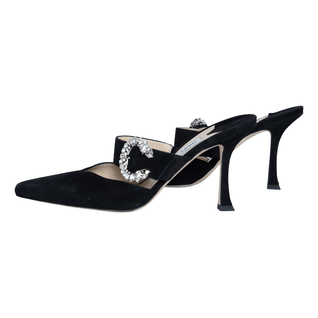 Jimmy Choo Black Suede Crystal Buckle Mules feature pointed toe, embellished buckle fastening, and well carved heels.