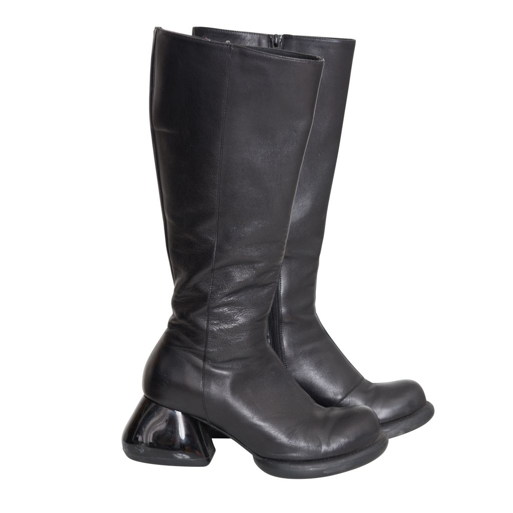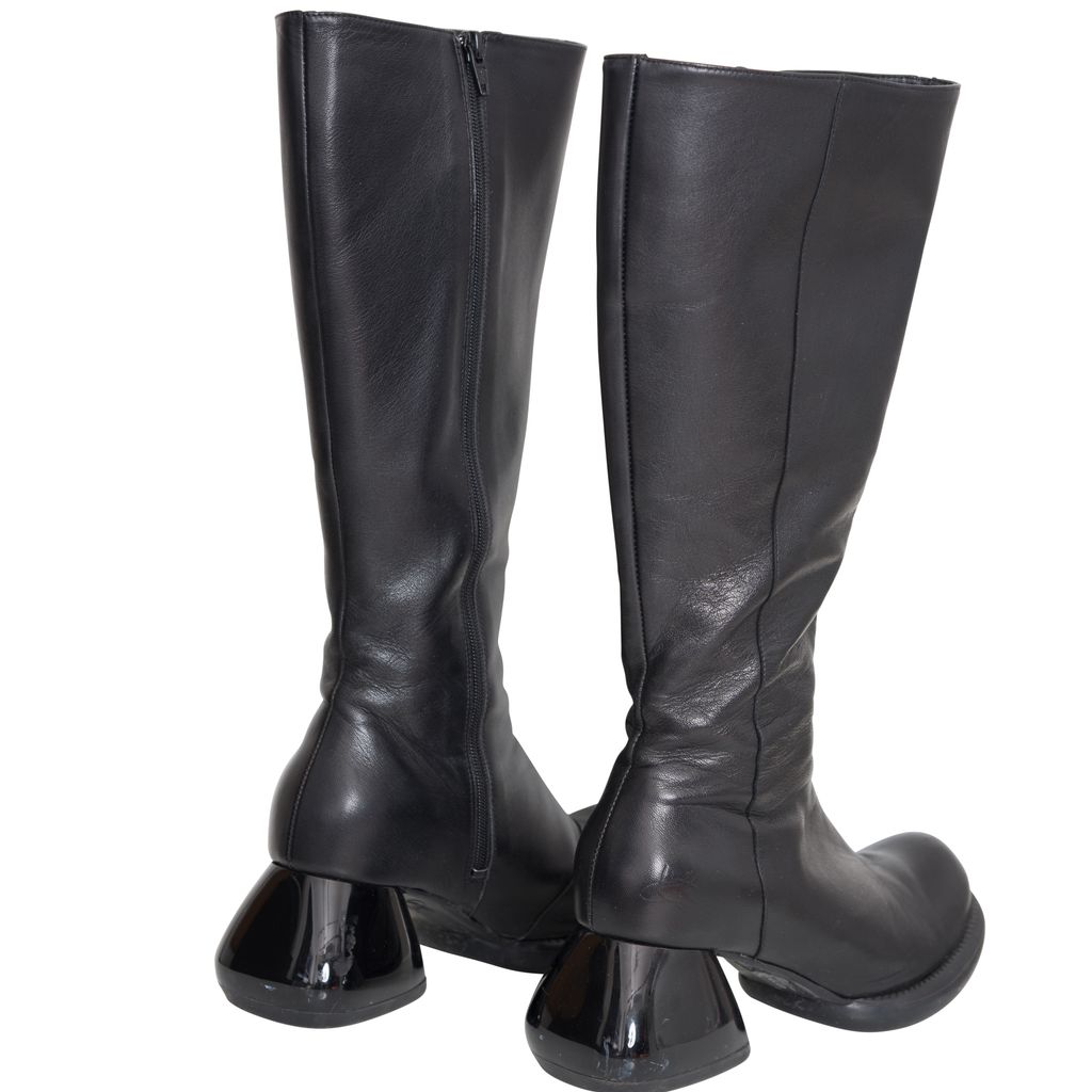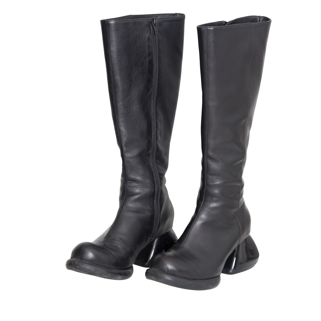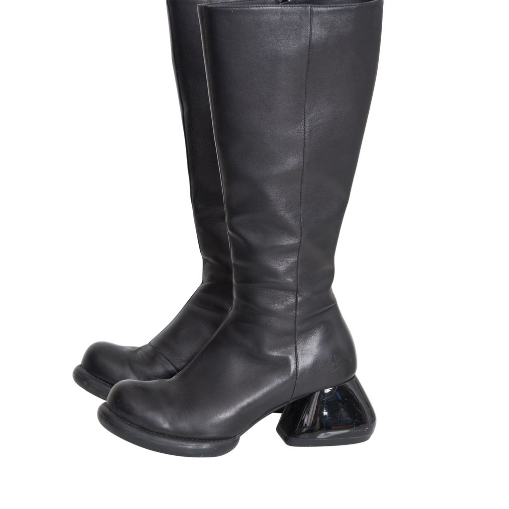 John Fluevog Haworth Boots features leather body, unique chunky heel, original Fluevog embossing, zipper closure.