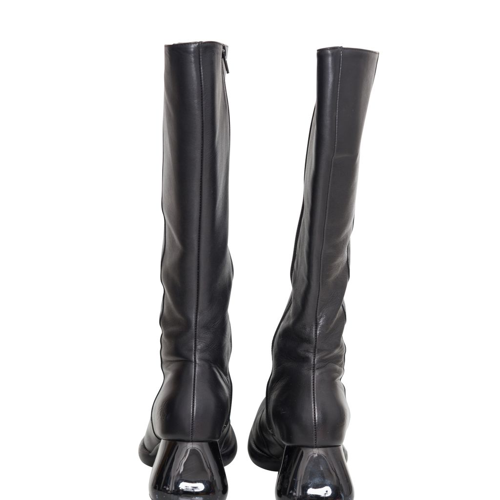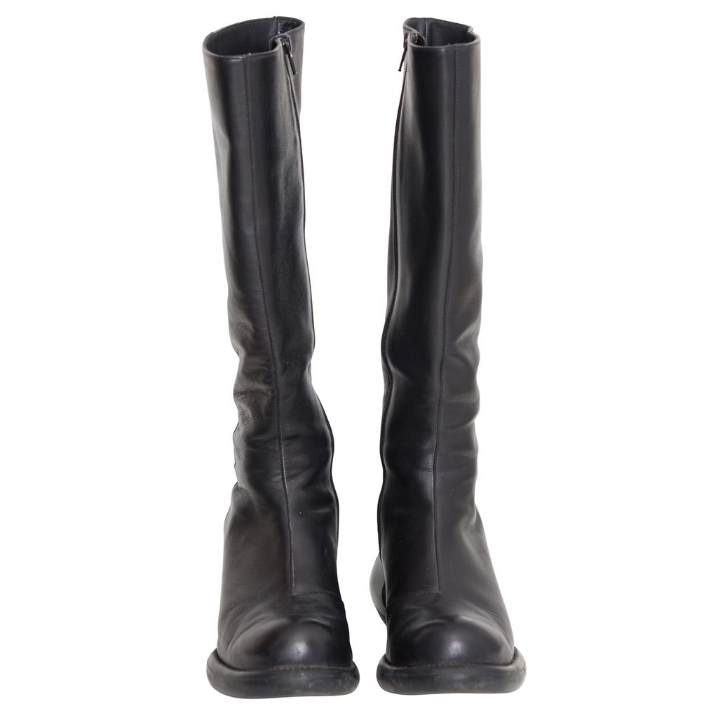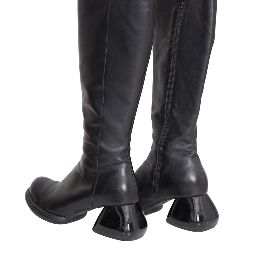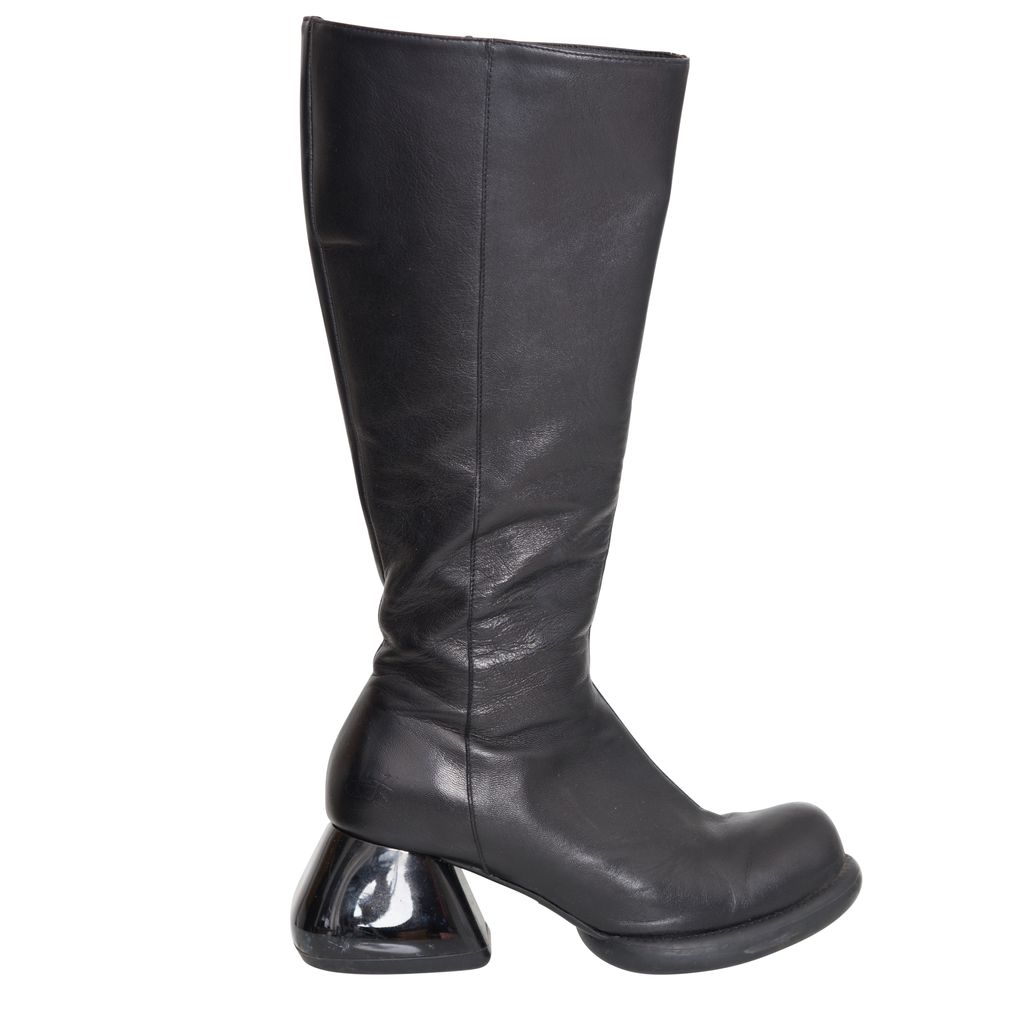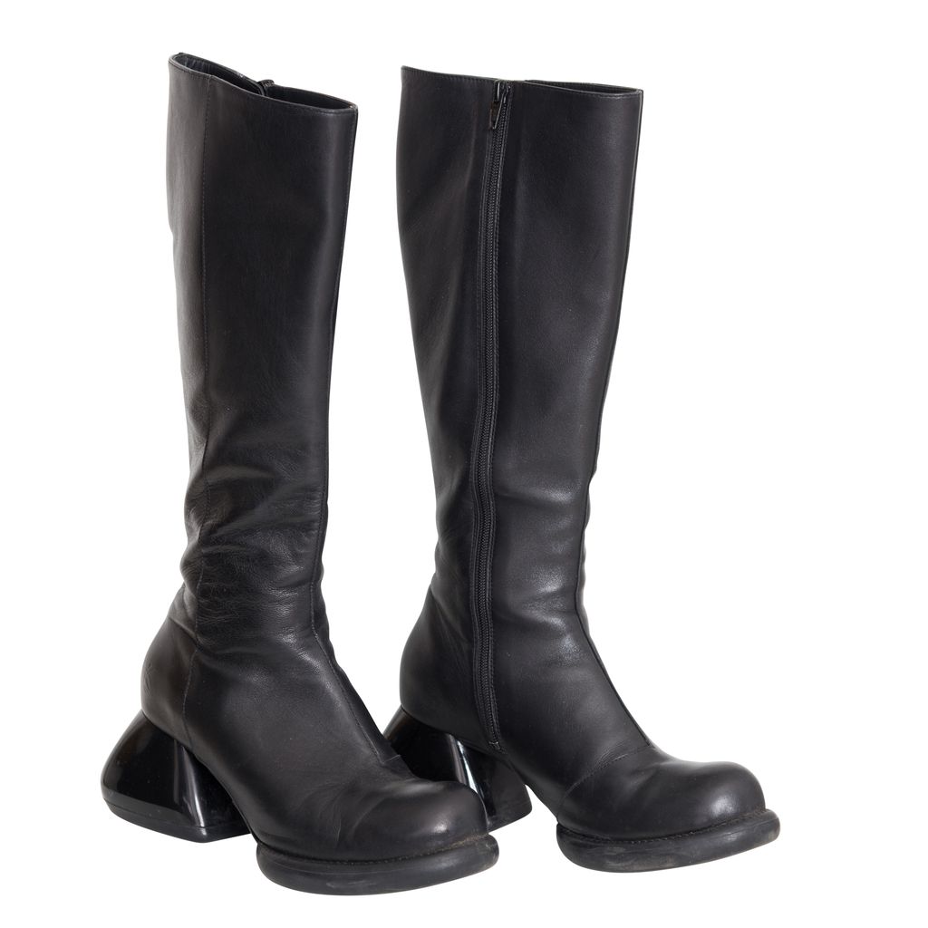 John Fluevog Haworth Boots features leather body, unique chunky heel, original Fluevog embossing, zipper closure.