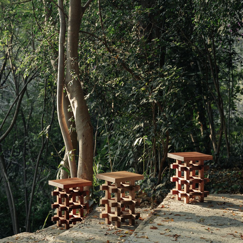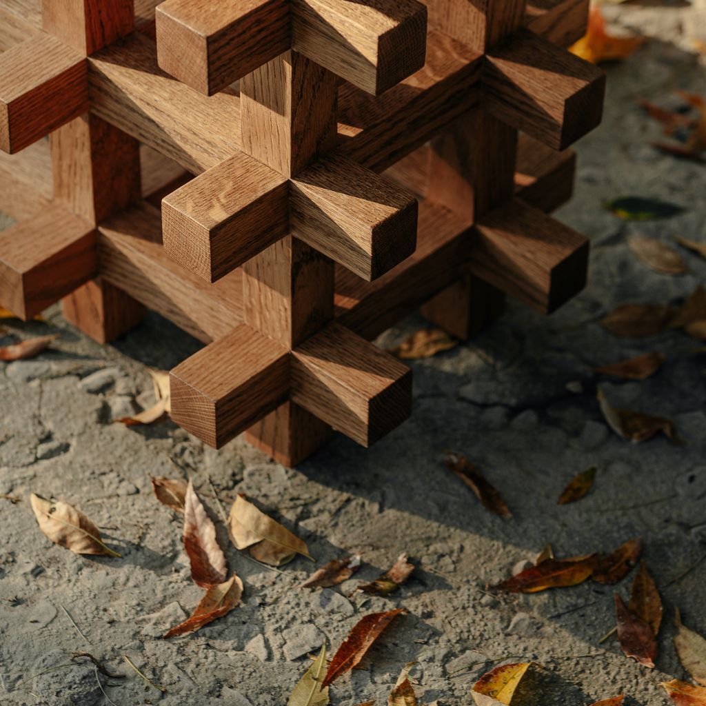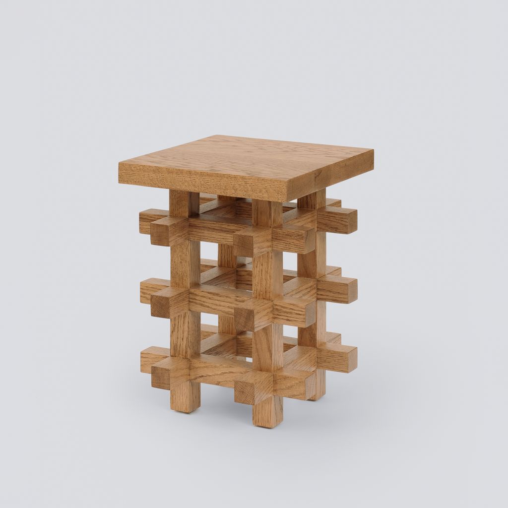 The JUNCO Stool by Daniel Couttolenc celebrates precision through interwoven structure. Constructed from interlocking Oak Wood beams with a Natural finish, it reinterprets joinery as visual rhythm. Echoing sacred proportion, each joint expresses unity between craftsmanship and geometry. Functional as both seat and sculptural object.