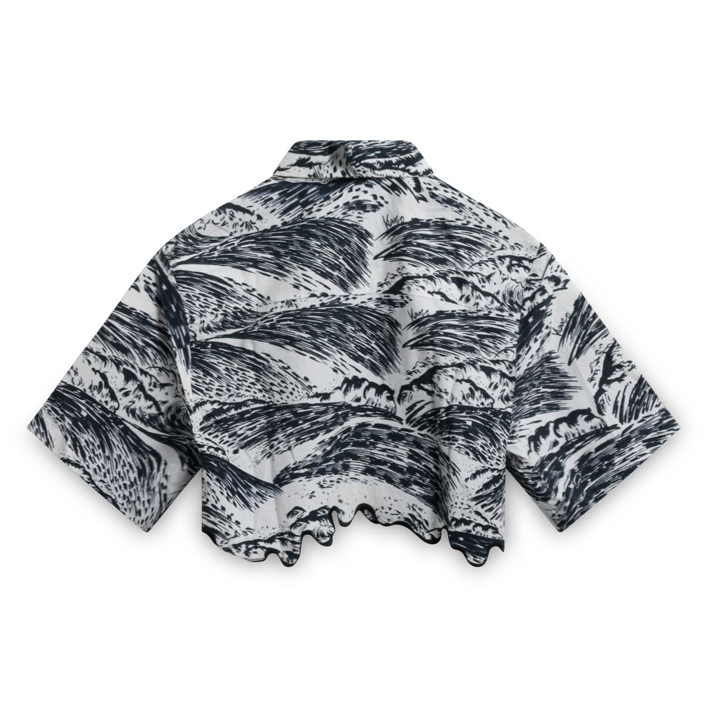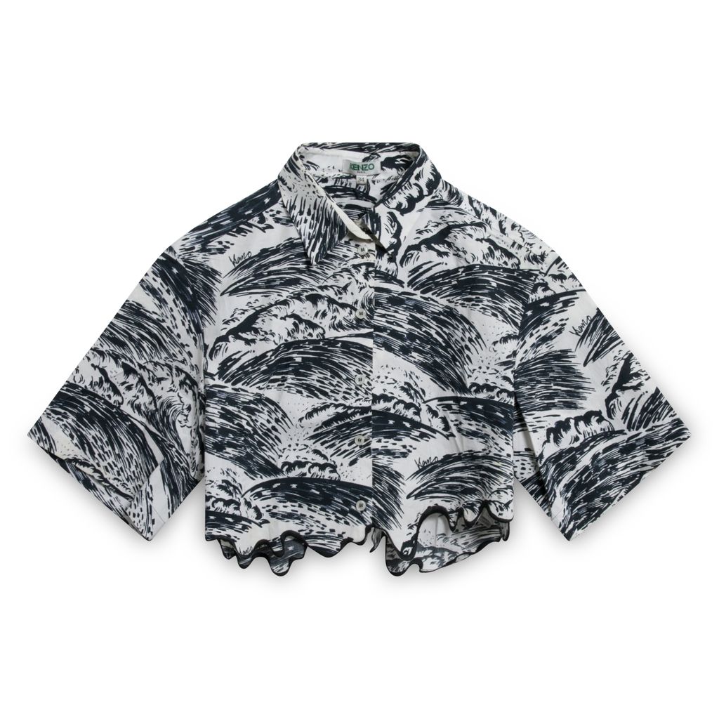 This printed poplin shirt from Kenzo features a point collar neckline, short sleeves, front button down closure, an embroidered wavy hemline and has a cropped silhouette. In excellent condition, brand new, tag attached.
