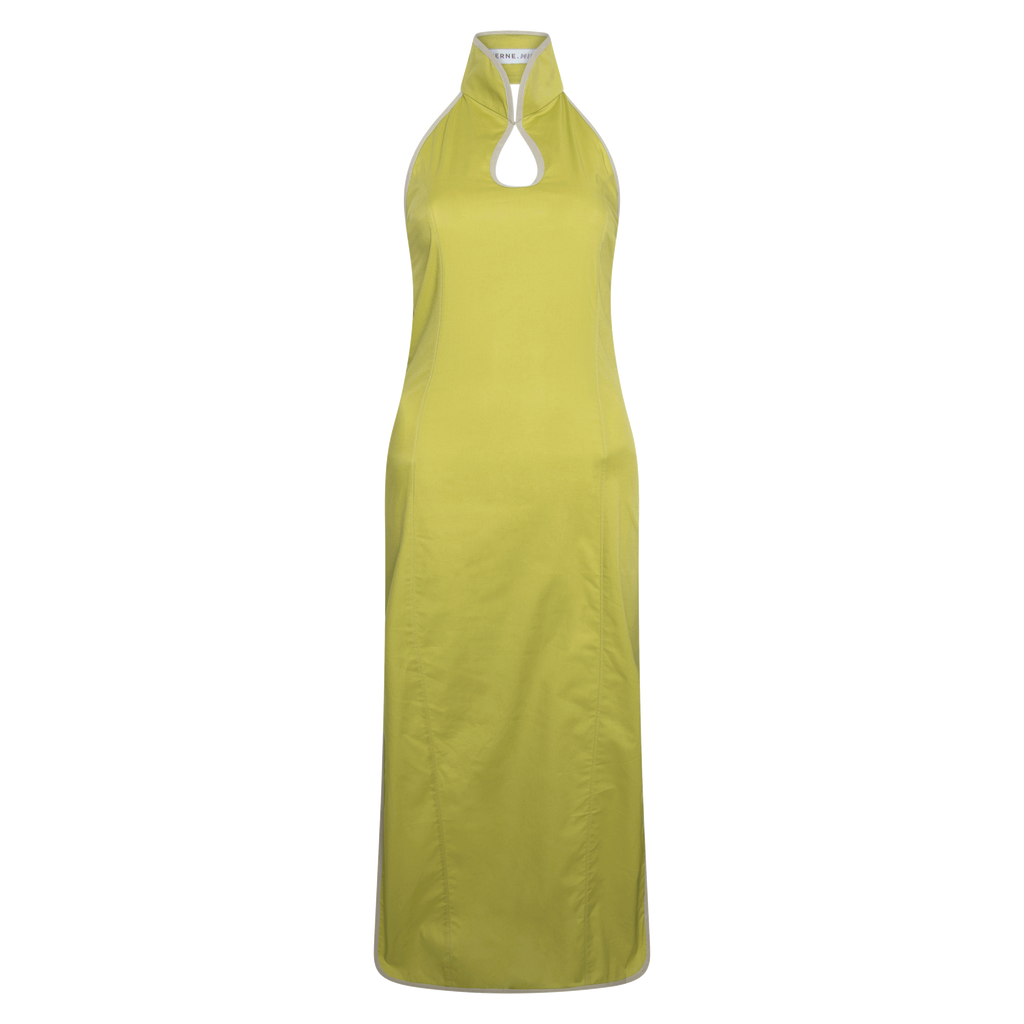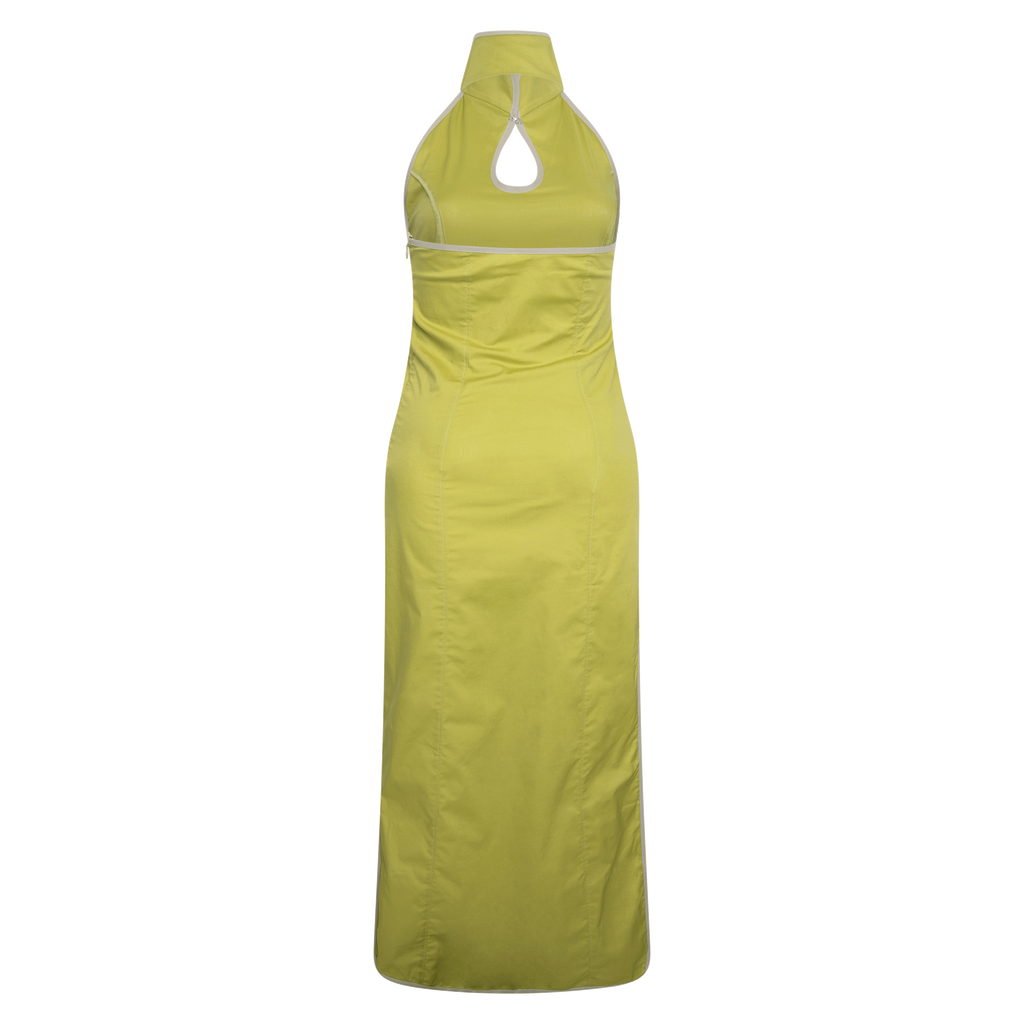 Kerne Milk Happy Hour Dress features mandarin collar, asymmetrical slit detailing, and open back.