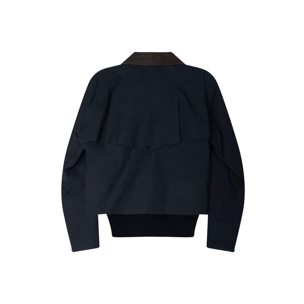 Kolor Navy Workwear Jacket features brown corduroy collar, 2 large flap pockets on front, front zip and snap button closure, and inner knit layer.