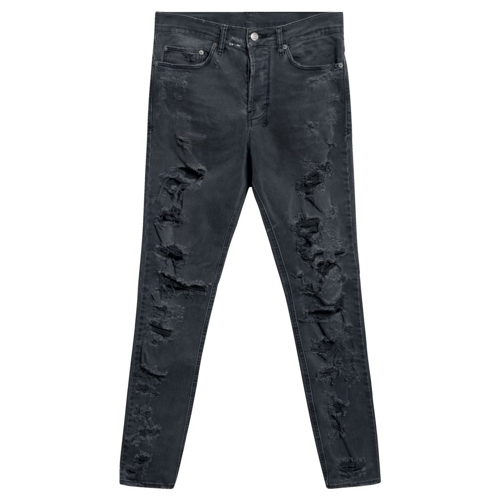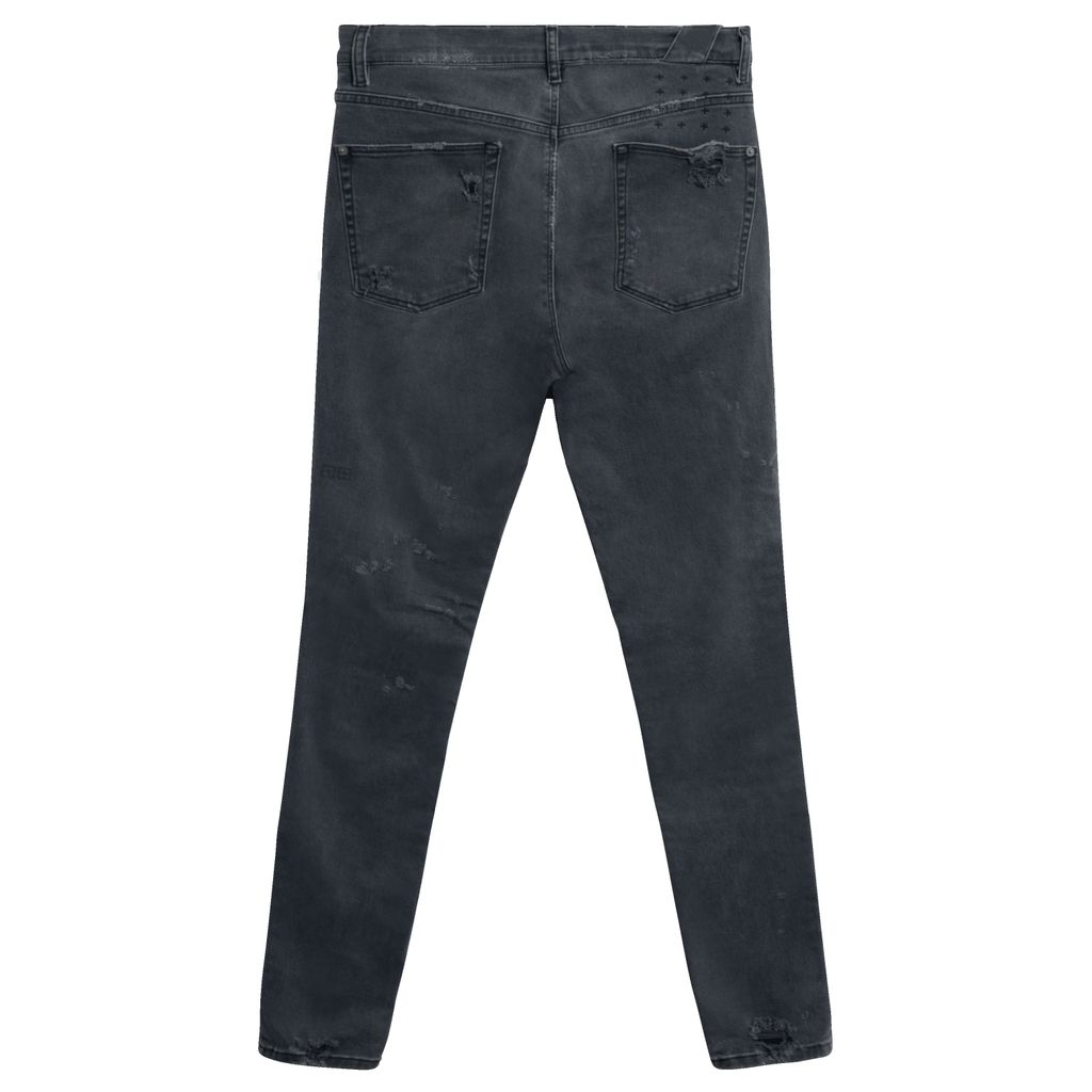 These distressed slim-leg jeans from Sydney label Ksubi are crafted from cotton-blend soft denim and feature a button fly, five-pocket style, and signature box crosses on the back. In good condition. Minor stain on front.