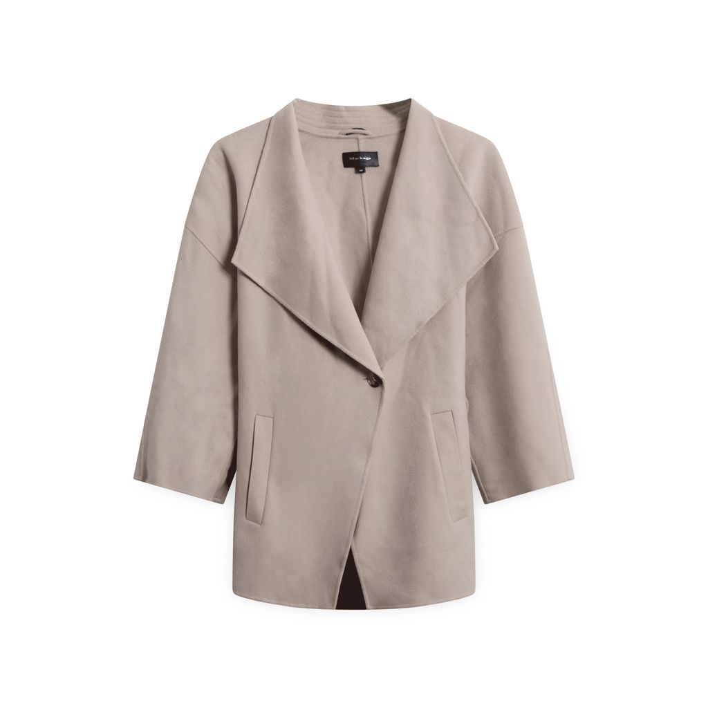 Gorgeous wool coat with a single brown button for closure, and tie around the waist.