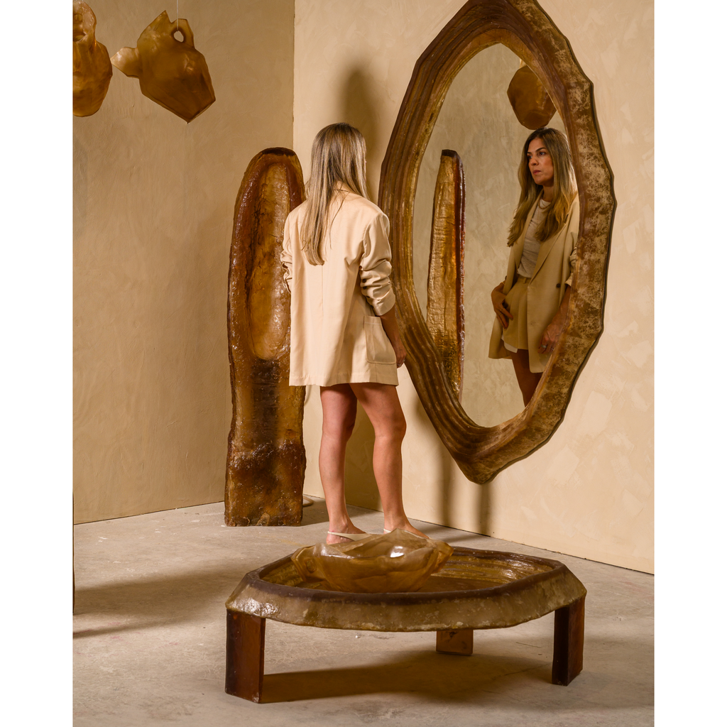 Part bench, part altar — this piece carries the visual rhythm of sediment layers. Its softly irregular shape and earthy translucency invite pause, weight, and ritual.