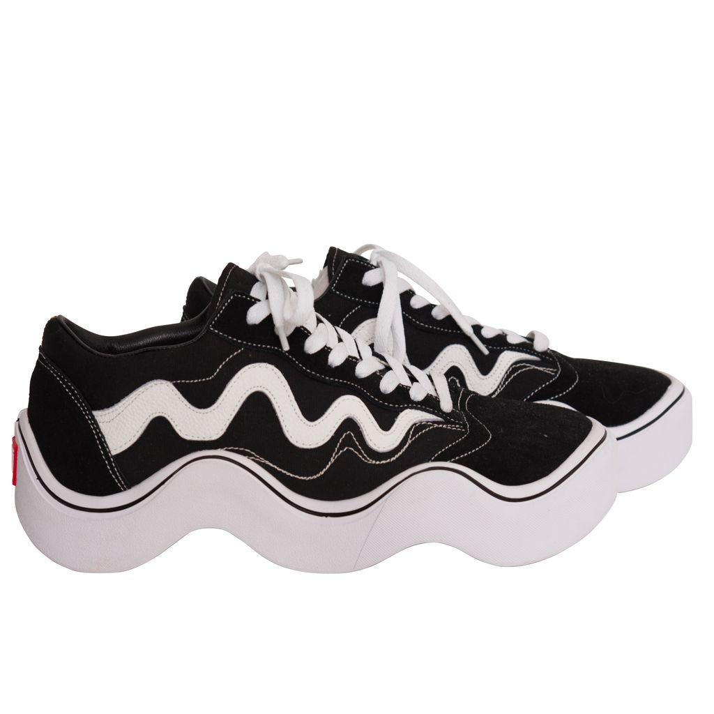 MSCHF x Tyga Wavy Baby features leather and rubber trim, 'wavy' sole, lace-up closure, and white laces.