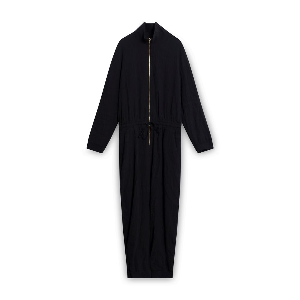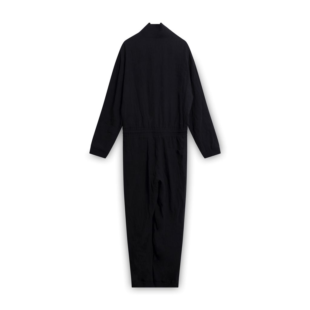 Nanushka Black Mock Neck Jumpsuit features small pleats, an elastic waistband with tie, gold zipper, and elastic ankles and cuffs.