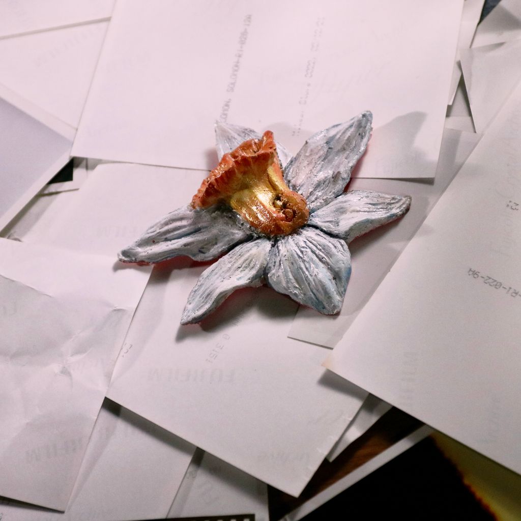 Dimensional resin pin brooch taking the form of the Narcissus Jonquilla flower, symbolizing the flourishing of individual identity and alluding to the dangers of self-obsession presented in the Greek myth of Narcissus.