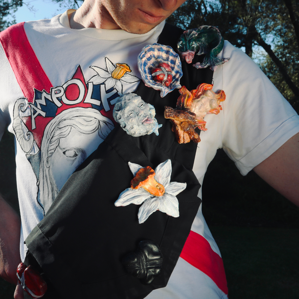 Joshua Solomon is a menswear and accessories designer from California. Trained classically as a sculptor and painter in ateliers in both Paris and Florence, followed by apprenticeships in ceramic studios in Sicily and Tuscany, his work reflects both an acutely emotional and neoclassical aesthetic sensibility while insisting on practical function. Having presented his first menswear collection in January of 2026, his small accessories and breastpins are wearable manifestations of the feelings innate to aspiration.