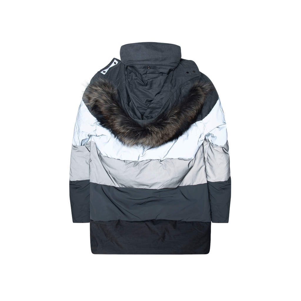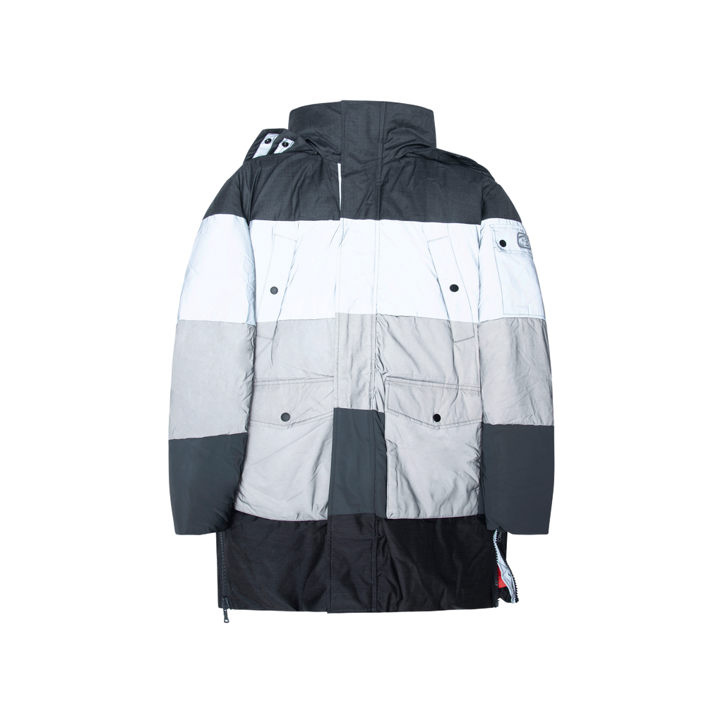 Nick Wooster x Paul & Shark Parka features four front pockets, one arm pocket on left arm, front hidden zip closure, hood, side zipper detail, and reflective detail throughout.