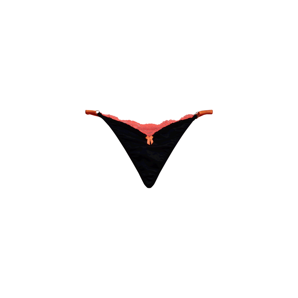 Orange and Black Numilia Thong features metal heart-shaped detail in the back, black heart-shaped elastic detail, sheer lace cut-out, satin adjustable straps,, metal heart-shaped strap details, and orange satin bows.