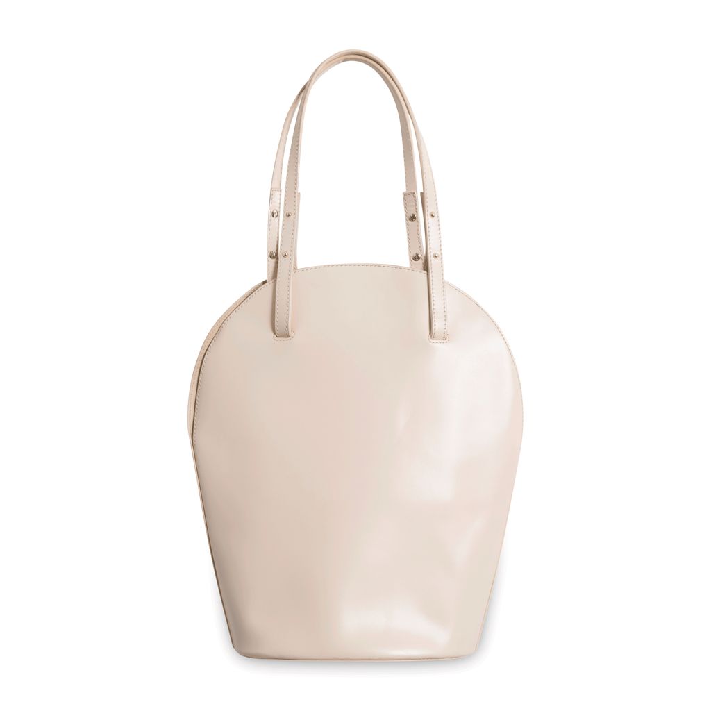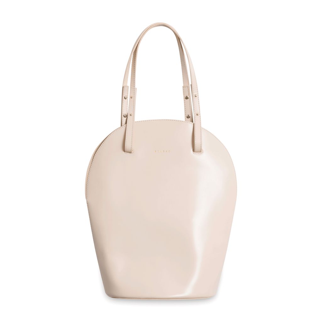 Pine43 SketchAround Leather Tote in Light Pink features an egg shaping, the Pine43 logo etched in gold, and silver studded pink handles.