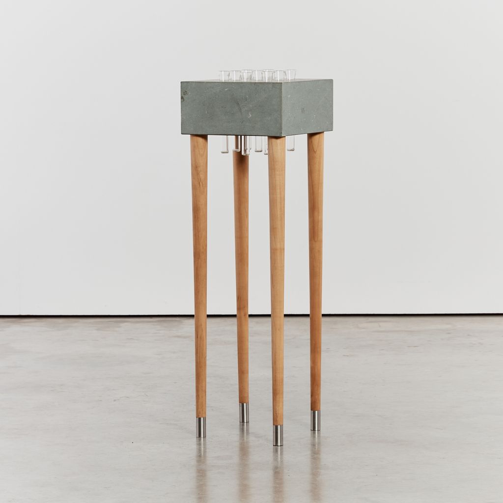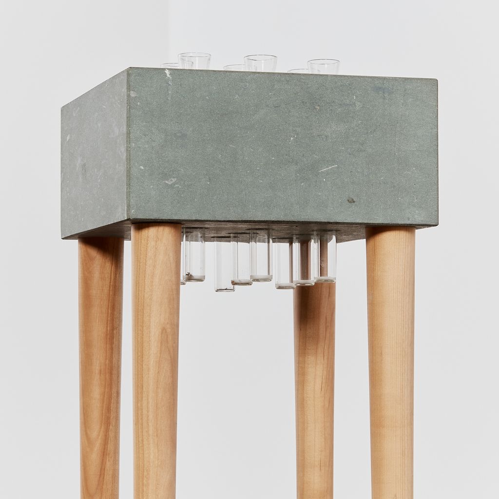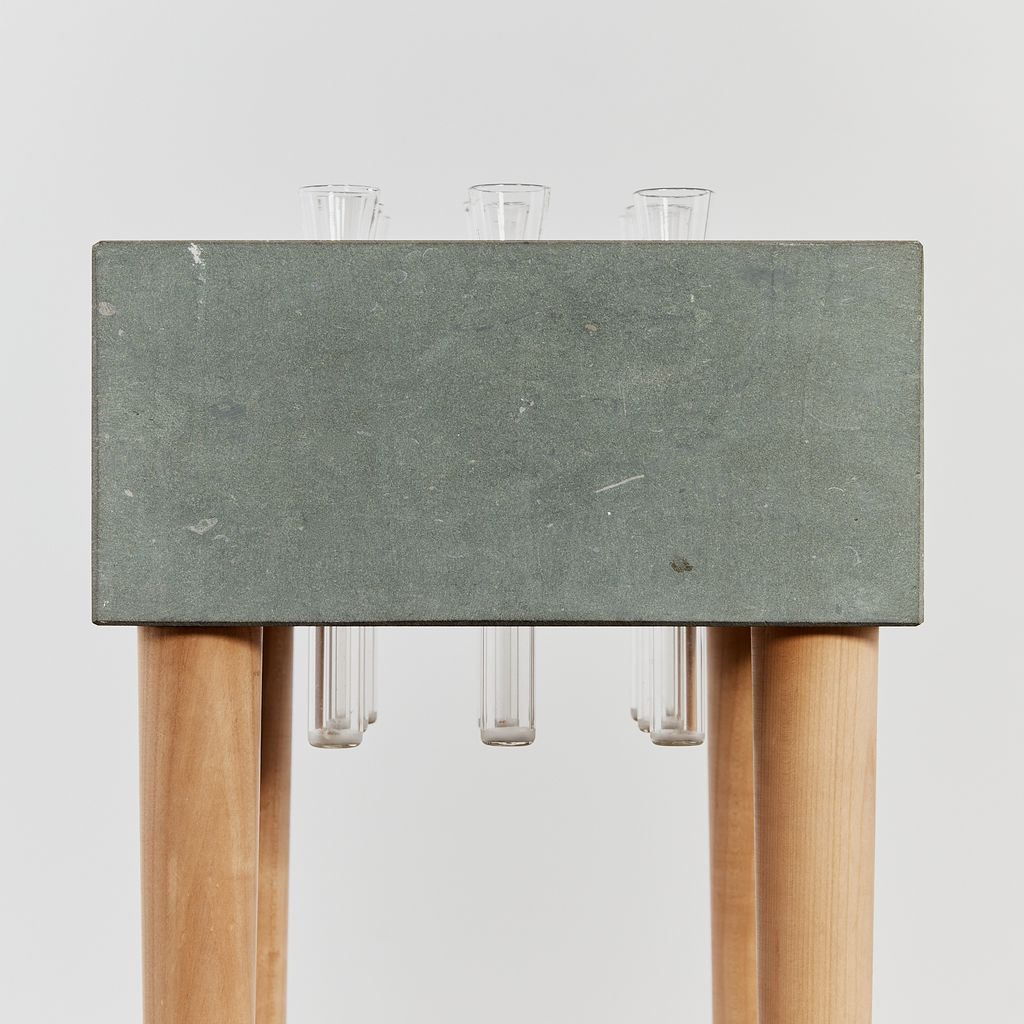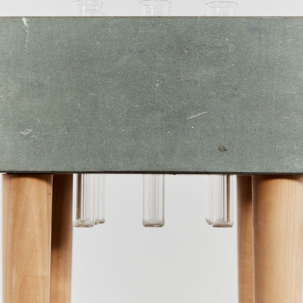 This statement piece features 9 glass test tubes suspended in stone, sitting atop contrasting wooden legs with steel caps.