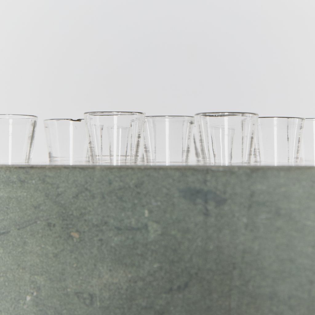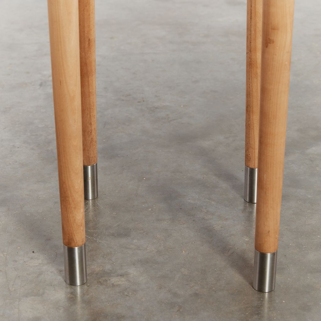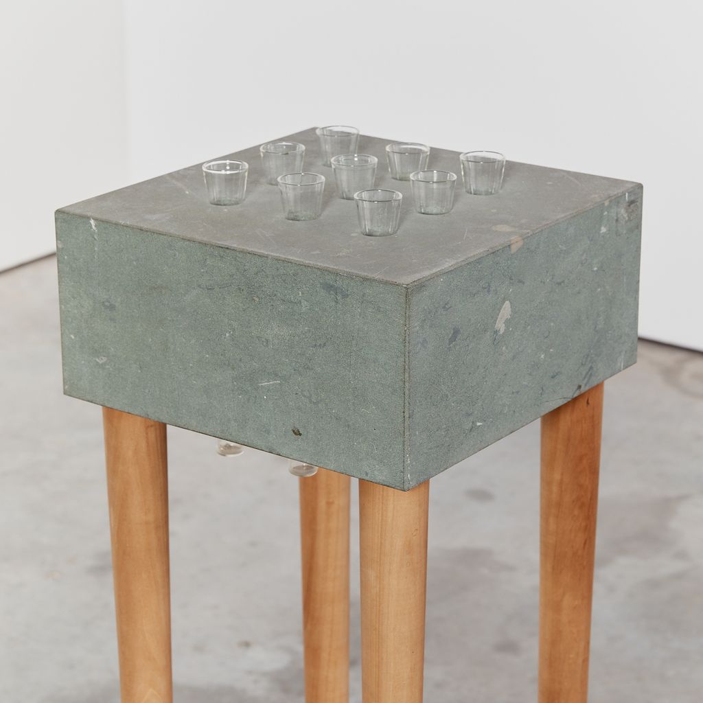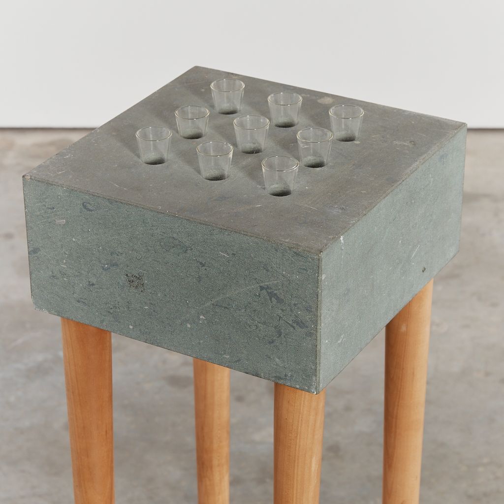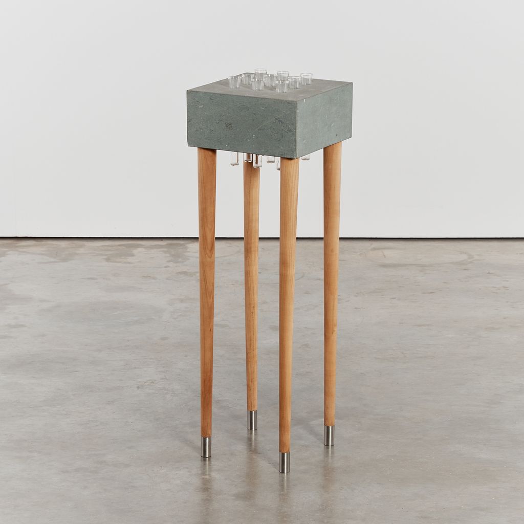 This statement piece features 9 glass test tubes suspended in stone, sitting atop contrasting wooden legs with steel caps.