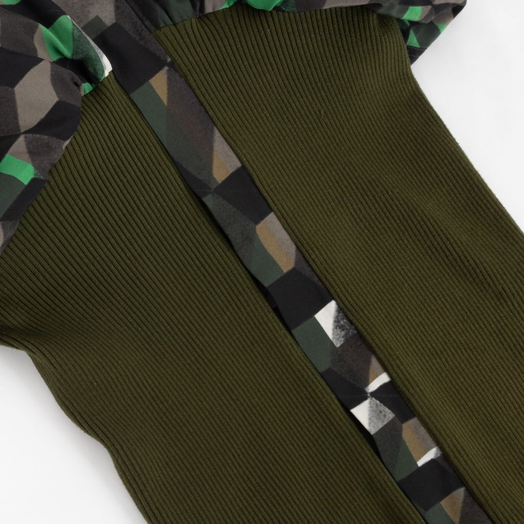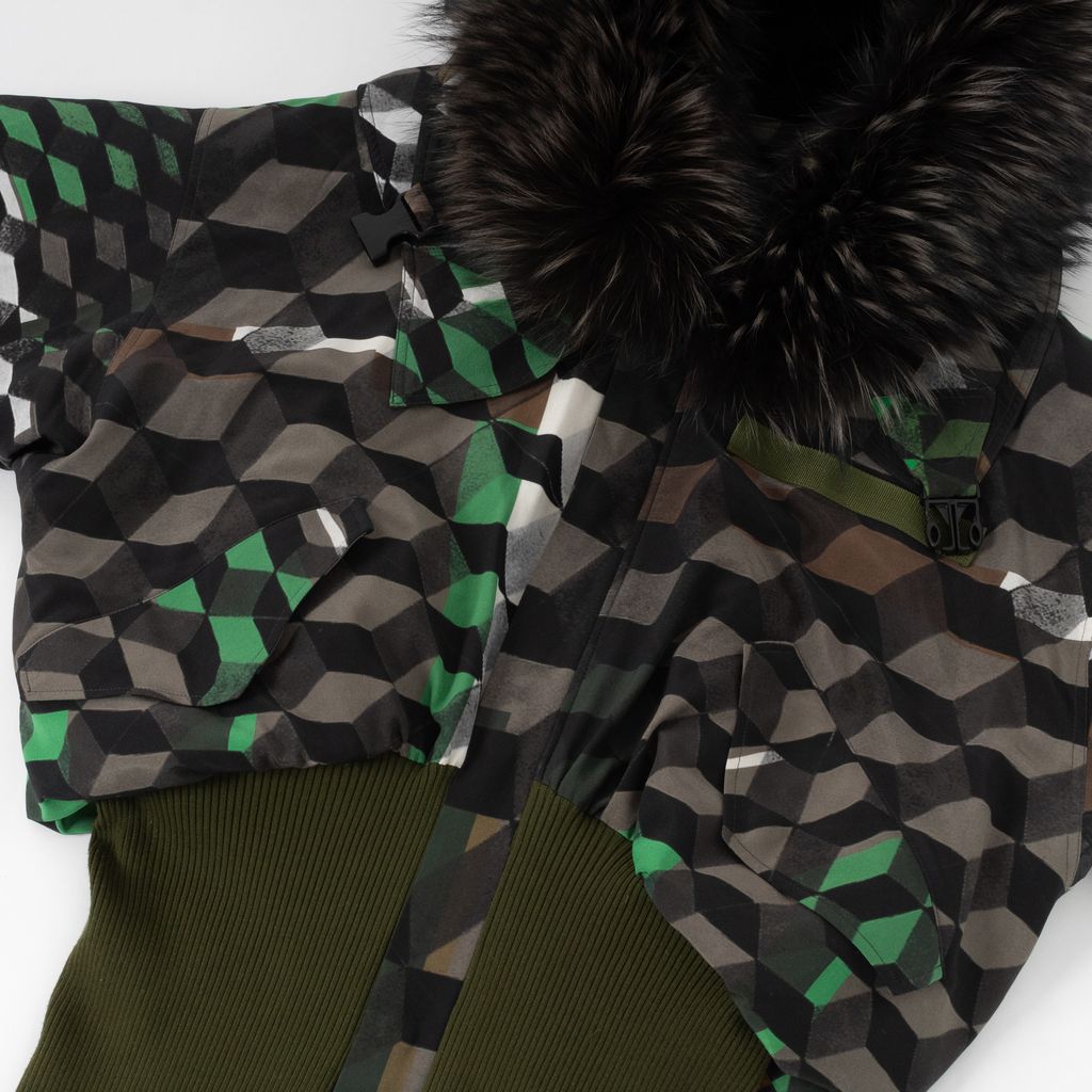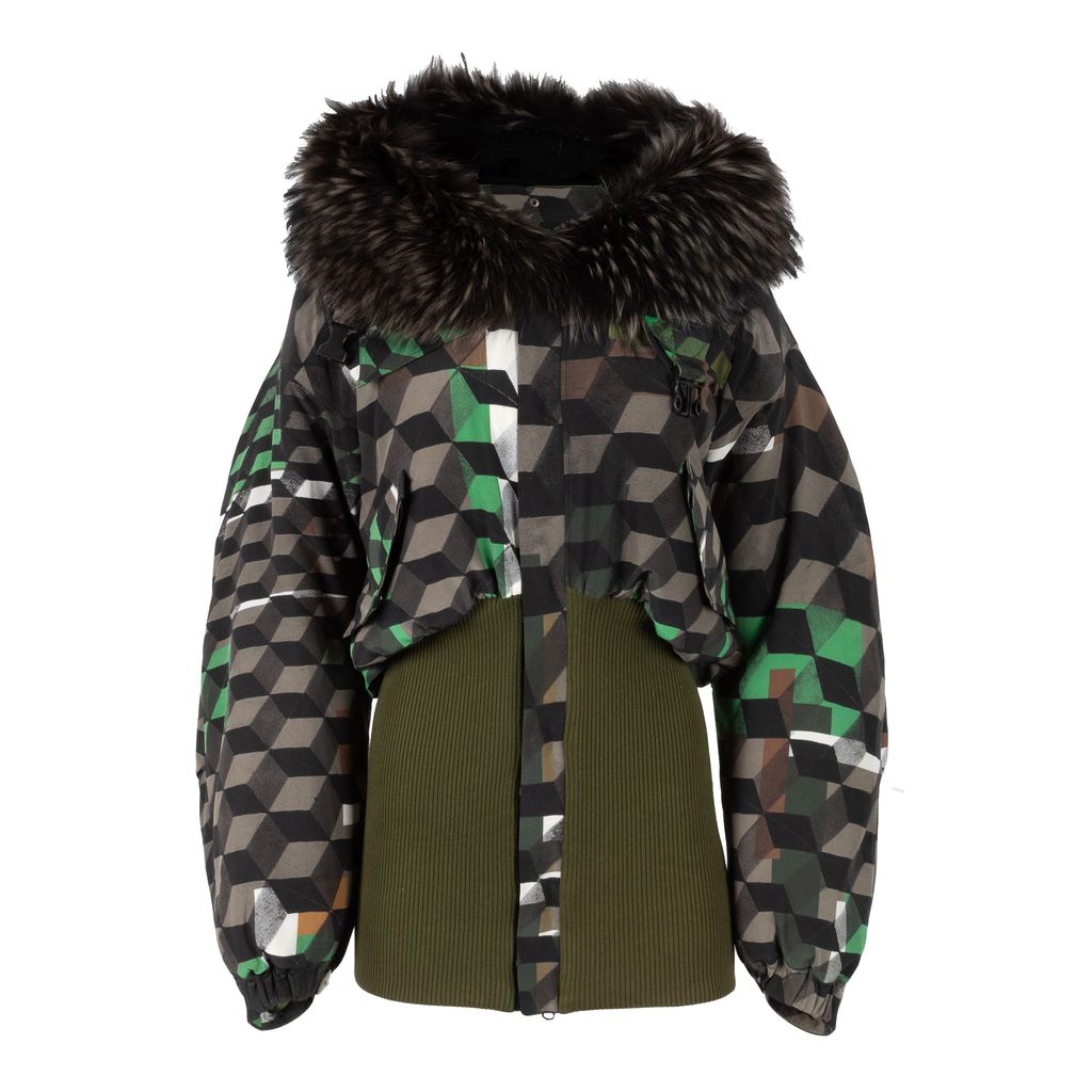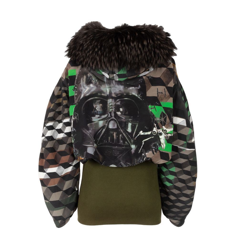 Calling all fans of the franchise, this Preen bomber jacket showcases a unique geometric and Star Wars graphic print to channel your fashion force in. Features green and brown geometric pattern, quilted body lining, fur lined hood, zip and snap closure front, Star Wars back graphic, rib knit lower half, buckle closure at hood, and set of flap covered pockets on front top.