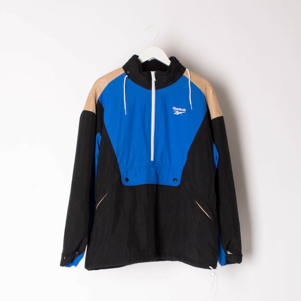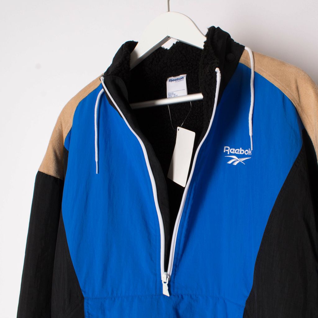 Brand new with tags, lined anorak from Reebok. Features attached hood that packs into the collar, drawstring hem for an adjustable fit, three front pockets and a back pocket, and sherpa lining. 100% nylon.